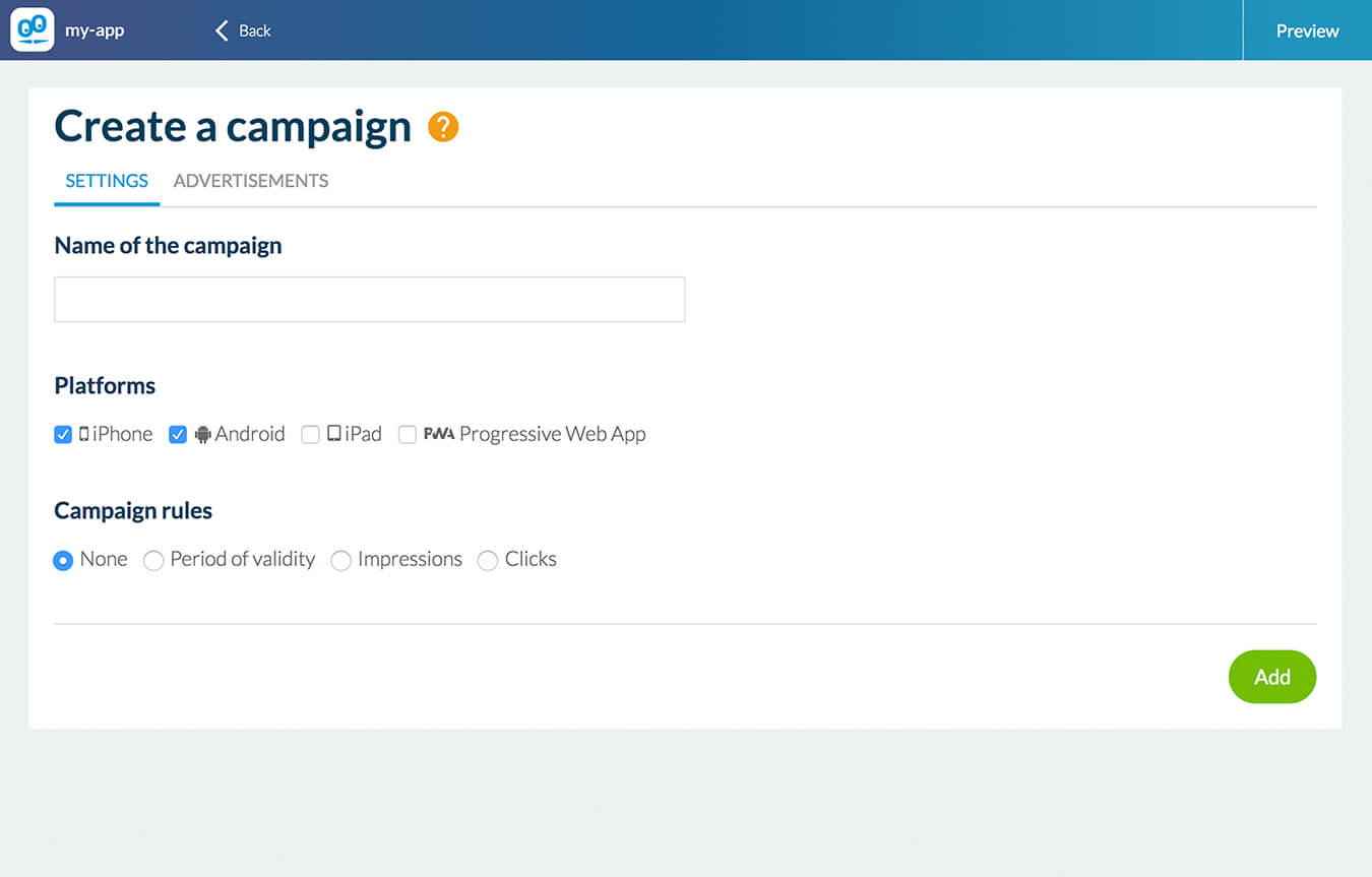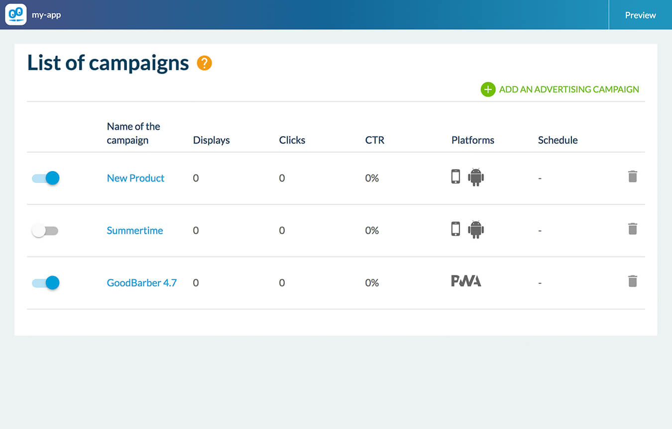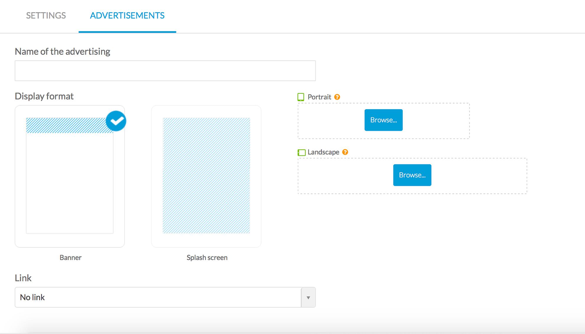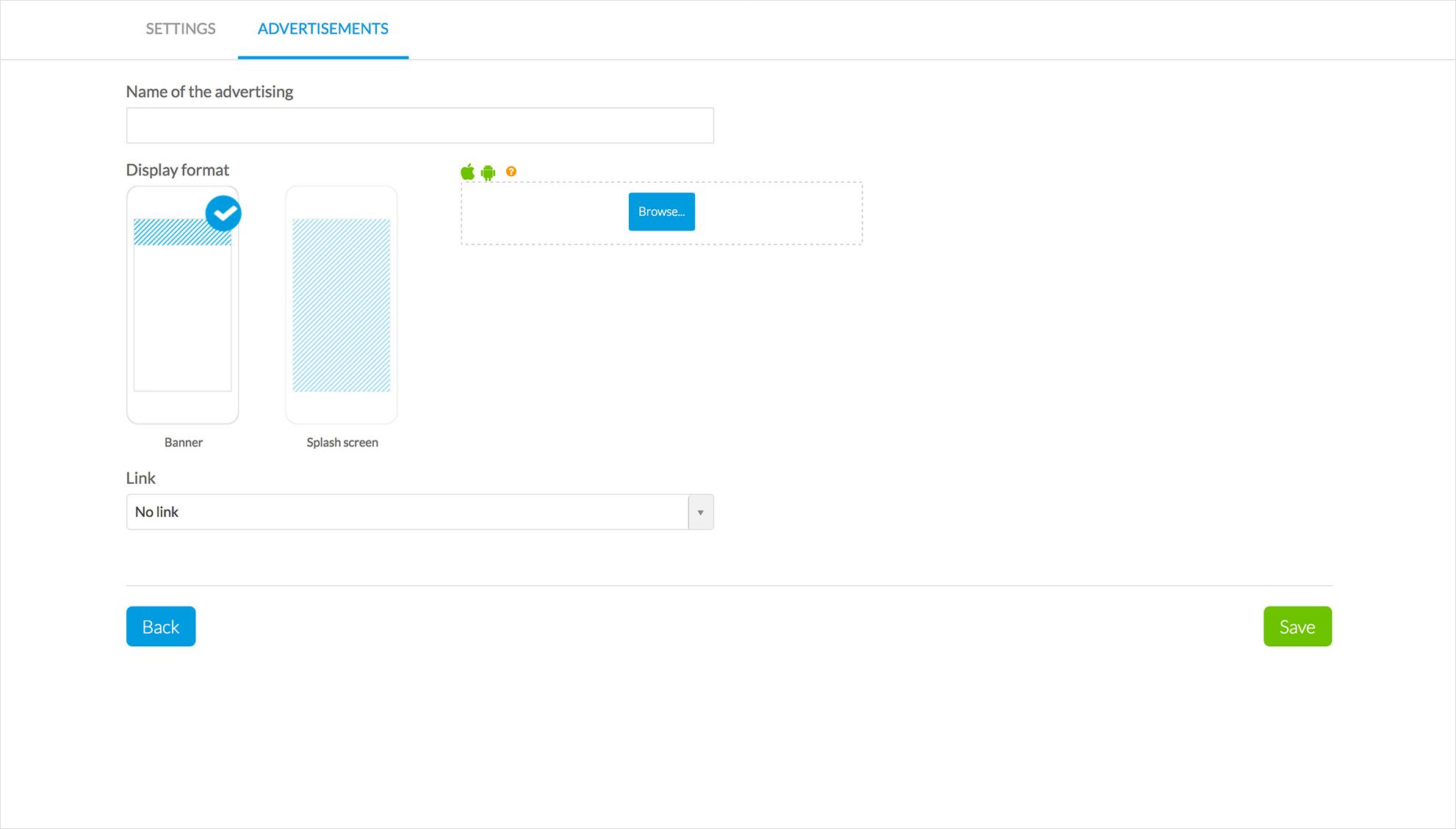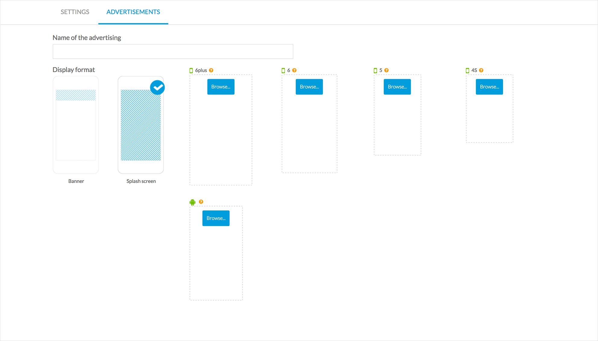Faz a gestão dos teus splash screens e ad banners. Cria as tuas campanhas ao selecionar determinados critérios: data, cliques, etc. Seleciona uma ou mais plataformas para distribuíres as tuas campanhas: iOS e/ou Android.