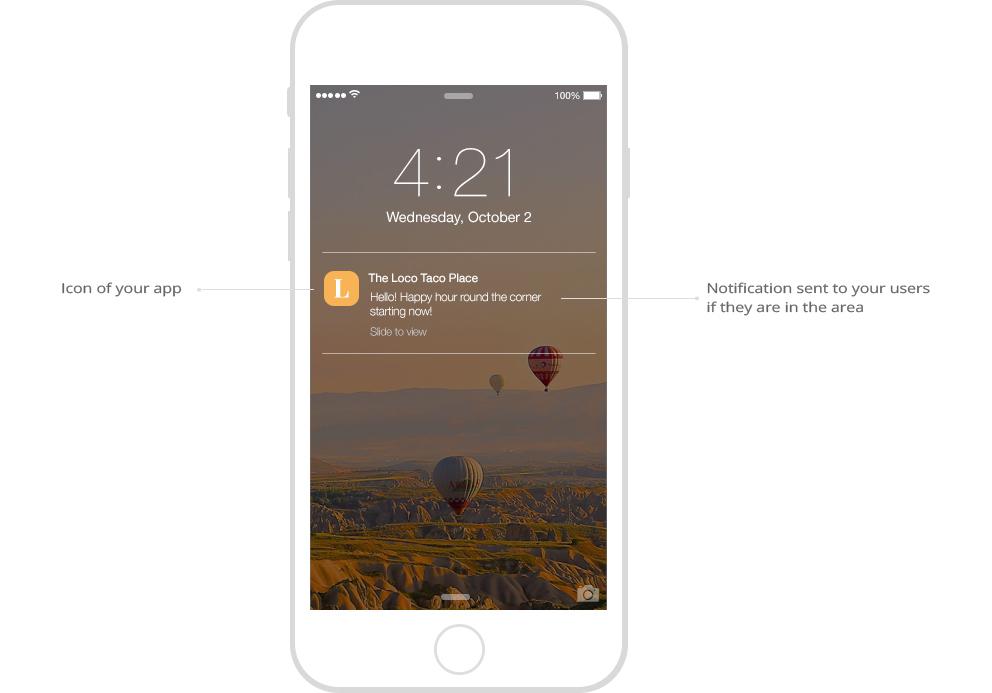 Envie notificações automáticas ao entrar ou sair da área geográfica designada, enquanto estiver usando o seu app.