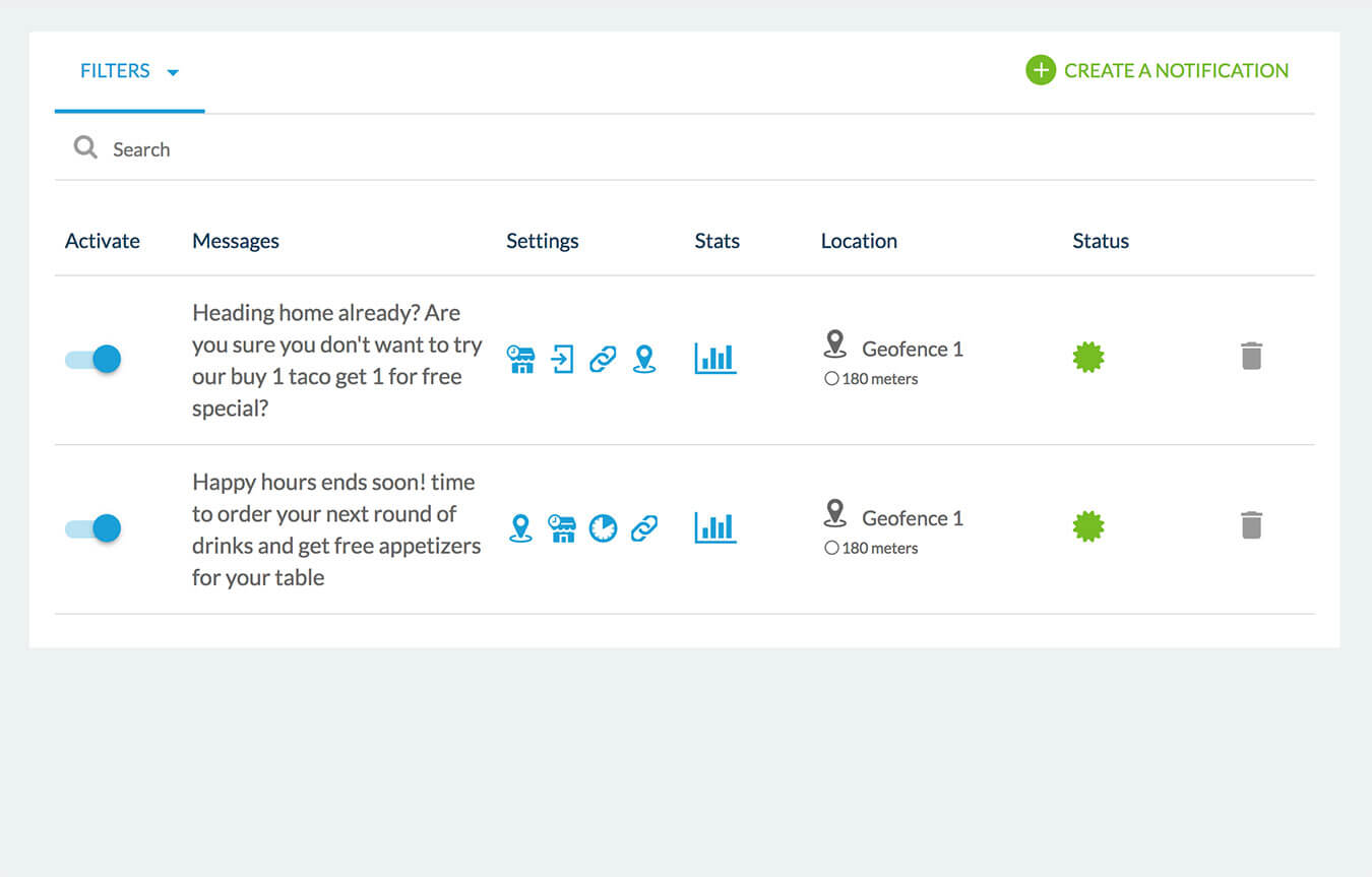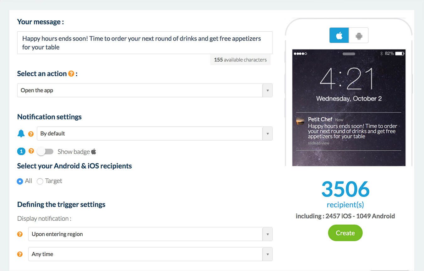 Para cada Geofence e de acordo com as configurações de destino, crie uma mensagem e defina uma estratégia de entrega enquanto estiver usando o seu app.