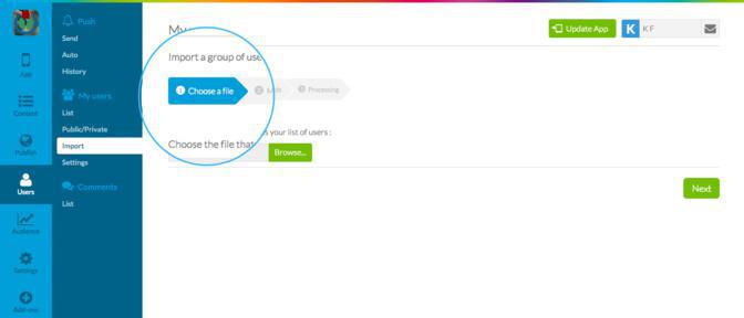 Escolhe um ficheiro CSV para importar toda a informação dos teus users.