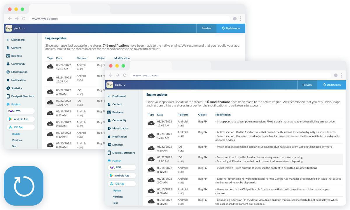 No seu back office, você pode ver o que foi atualizado por nossos desenvolvedores e quais novos recursos ou modificações que você fez no seu app exigem o envio de uma nova versão para as lojas.