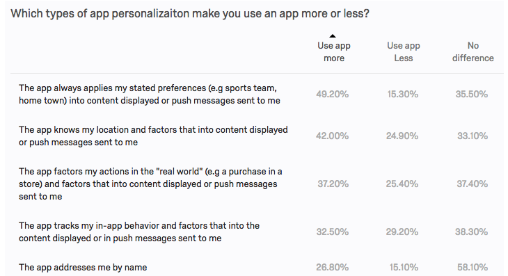 Quais tipos de personalização de aplicativo fazem com que você veja um aplicativo mais ou menos? Usar mais o app Usar menos o app Indiferente O aplicativo sempre aplica as minhas preferências declaradas (por exemplo, time de esporte, cidade natal) ao conteúdo exibido ou mensagens push enviadas para mim 49.20% 15.3% 35.5% O aplicativo sabe a minha localização e considera isso no conteúdo exibido ou nas mensagens push enviadas para mim 42% 24.90% 33.1% O aplicativo fatora minhas ações no "mundo real" (por exemplo, uma compra em uma loja) e os reatores em conteúdo exibido ou mensagens push enviadas para mim 37.2% 25.4% 37.4% O aplicativo rastreia o meu comportamento no aplicativo e os fatores para o conteúdo exibido ou em mensagens push enviadas para mim 32.5% 29.2% 38.3% O aplicativo me chama pelo nome 26.8% 15.1% 58.1%