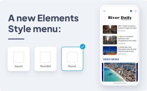 Nós nunca dizemos o suficiente: O design do seu app desempenha um papel vital no sucesso do mesmo. É claro que os recursos, desempenho e o próprio conceito são extremamente importantes para que um app móvel chame a atenção de seus usuários e tenha sucesso. No entanto, a primeira coisa que um usuário percebe, depois de iniciar um app, é o seu design. O design do seu app móvel causa a primeira impressão. E se o design não for atraente, adivinhem? O usuário irá procurar outro app. Para sua sorte, os designers da GoodBarber estão sempre desenvolvendo novos temas ou atualizando os modelos, mantendo-se atualizados sobre as últimas tendências de design para modernizar a aparência dos seus apps. Um dos nossos projetos mais recentes é o Design System da GoodBarber. Este é um projeto grande e você saberá mais sobre ele em breve ;) Fique ligado! Enquanto isso, estamos lançando novos elementos de design que modernizarão seus belos apps: Um novo menu Estilo dos Elementos e o efeito redondo nas miniaturas e células.