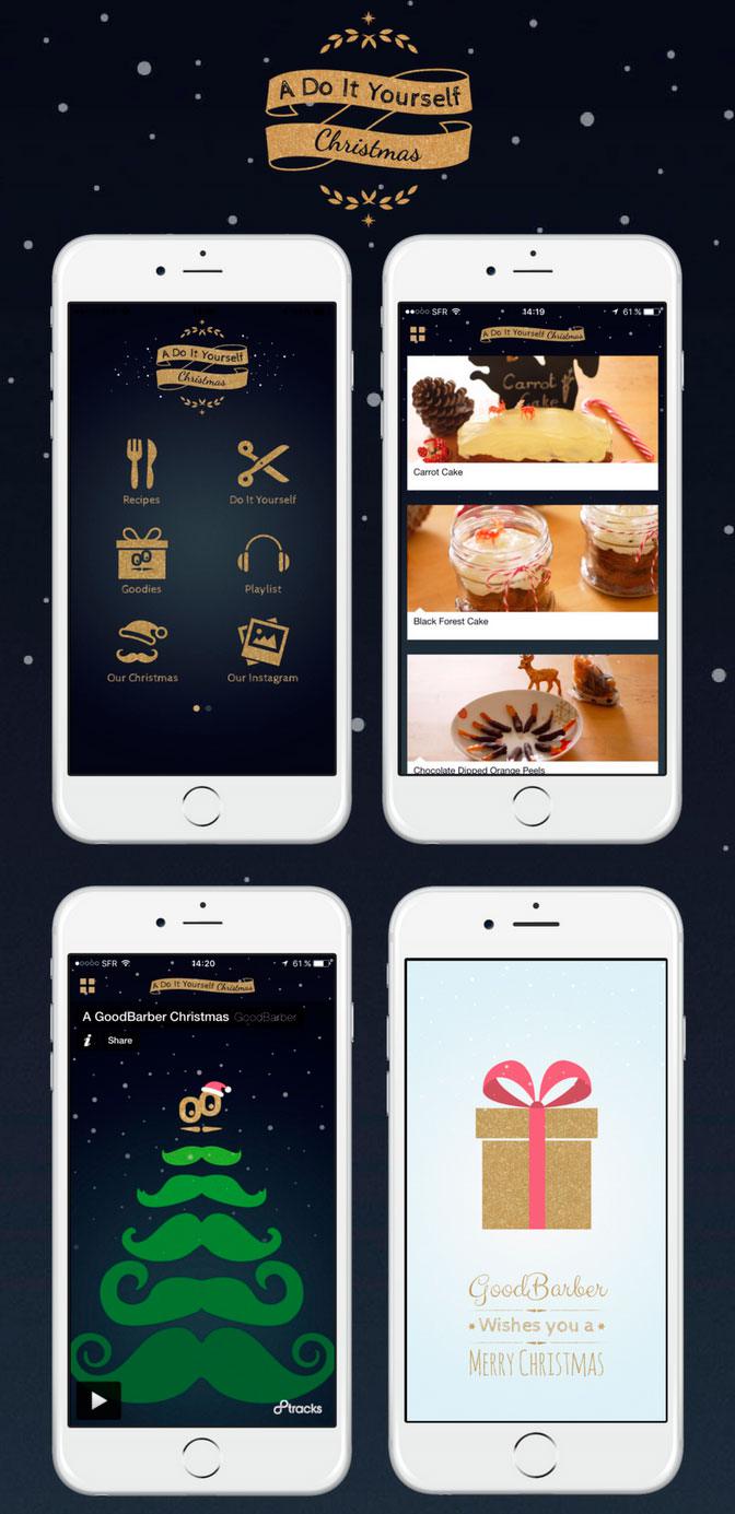Como o nosso aplicativo de Natal DIY foi antes de tudo um gesto para desejar aos nossos clientes um Feliz Natal, nós realmente queríamos que ele transmitisse o verdadeiro espírito natalino, como um cartão desejando boas festas, mas com a coolness e as funcionalidades de um aplicativo nativo. Nosso principal objetivo não estava relacionado com vendas, mas sim em fazer com o natal dos nossos clientes mais leais fosse ainda mais especial. Se ao final, o app gerasse mais reconhecimento sobre a plataforma da GoodBarber, seria apenas a cereja no bolo!