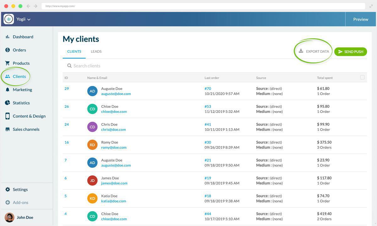 No menu Clientes, agora você encontrará um novo link em seu back office: Exportar dados.