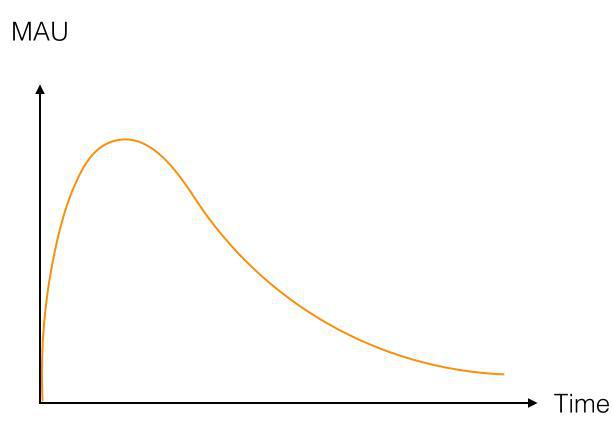 O gráfico acima mostra um ciclo de vida típico de uma app. No eixo do X está o tempo e no eixo Y o número de UMAs.