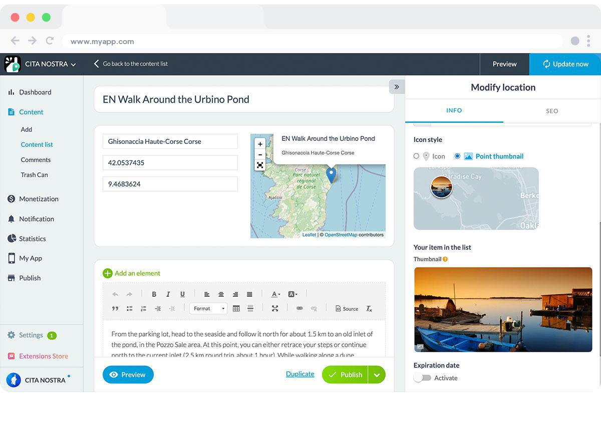 Em seu back office, acesse o menu Meu aplicativo > Conteúdo. Vá para “Lista de conteúdo" e escolha a seção "Mapa". Selecione o local para o qual deseja definir seus novos ícones em “Editar local". No painel de edição, você pode escolher entre “Ícone" e “Colocar miniatura". Você pode carregar um ícone colorido ou optar por exibir a miniatura de seu local. Agora cabe a você aperfeiçoar seu aplicativo!