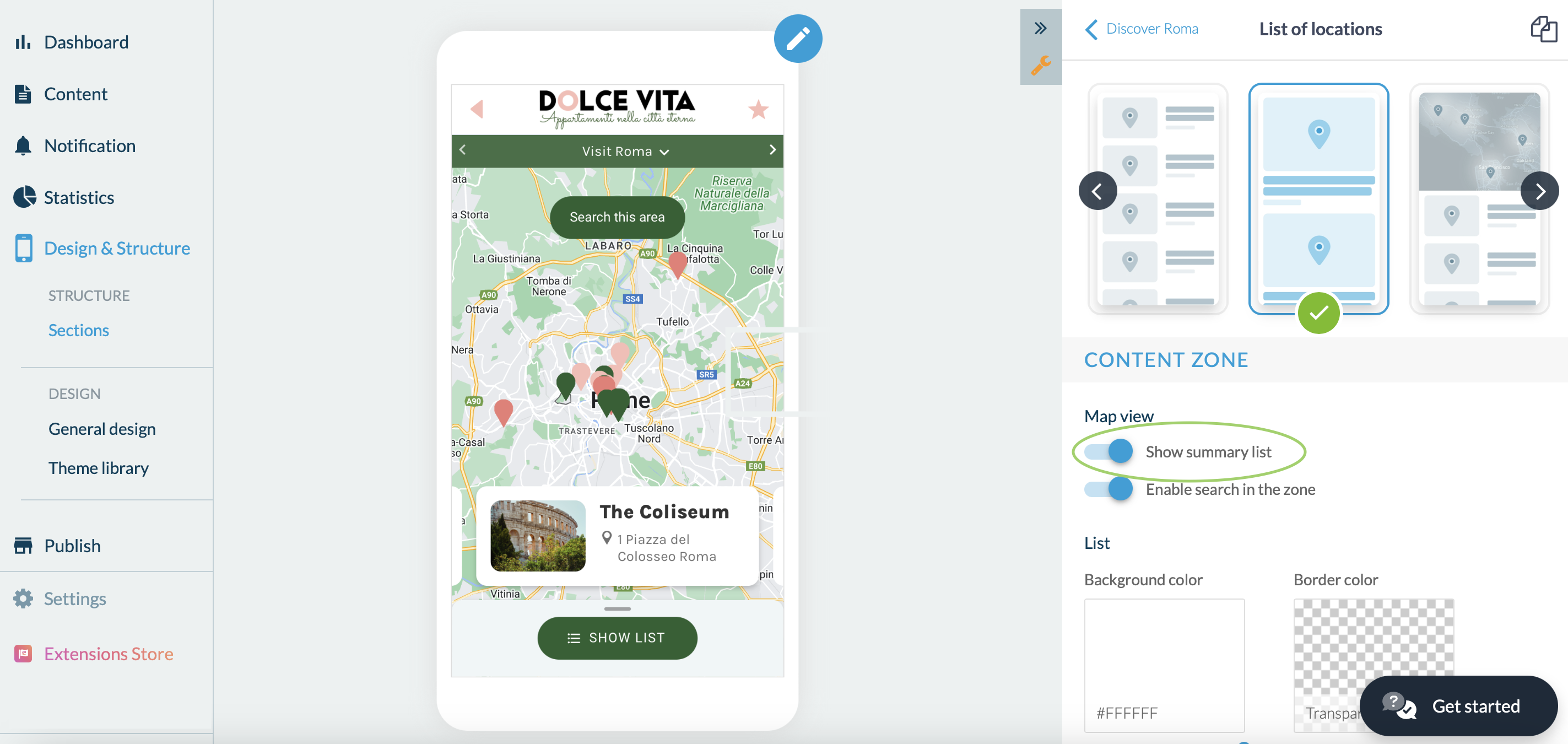 No seu back office, no painel de edição de sua lista de locais > Zona de conteúdo > Visualização de mapa > alterne o botão "mostrar lista de resumo". O controle deslizante agora será exibido na visualização do mapa dos locais.