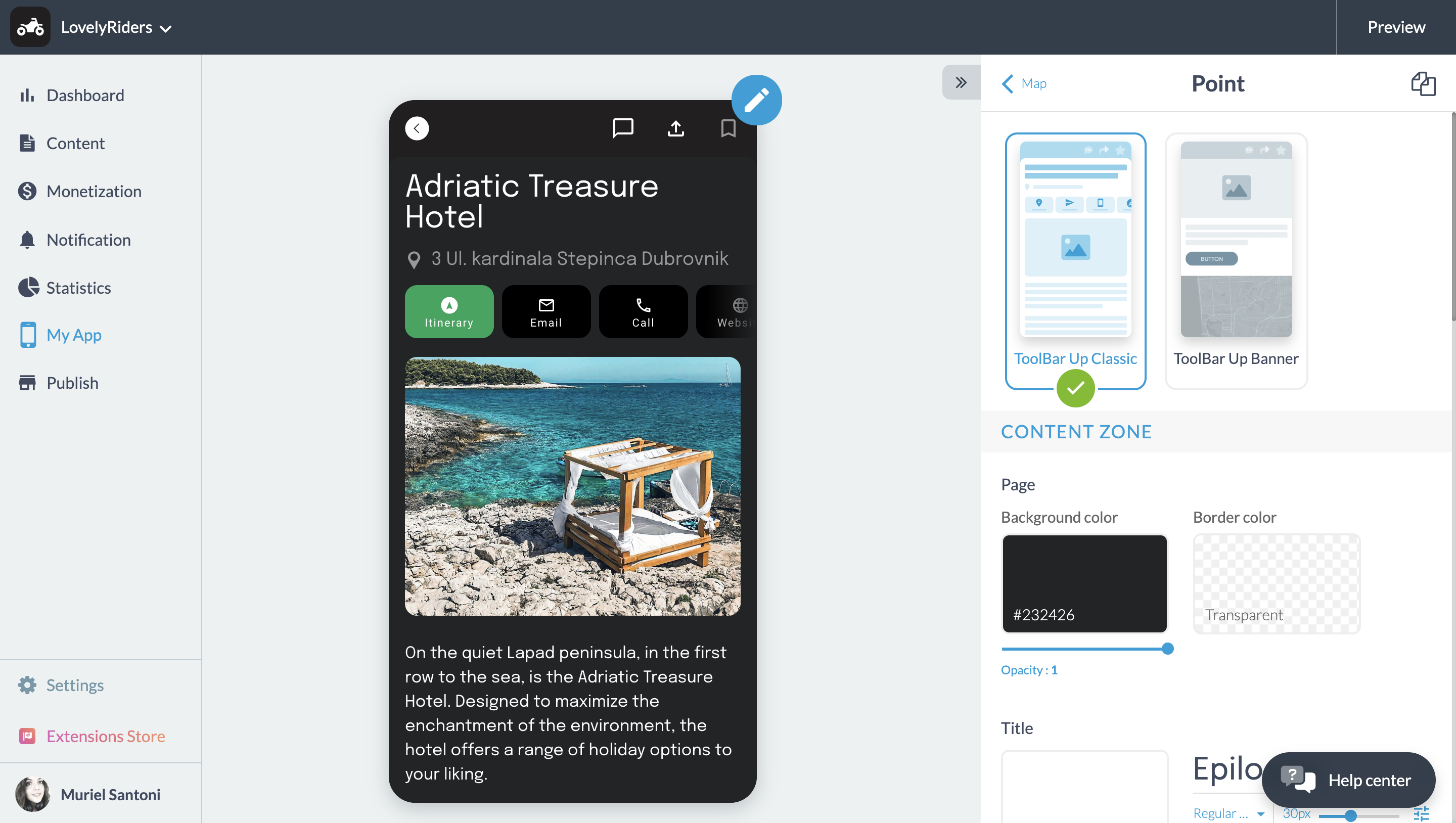 No seu back office, aceda ao menu My app > Estrutura. Em seguida, escolha a secção do mapa à qual pretende aplicar o modelo clássico ToolBar Up ou crie um novo modelo. Em seguida, seleccione a vista de detalhes. Só falta selecionar o modelo ToolBar Up Classic e definir os respectivos parâmetros.