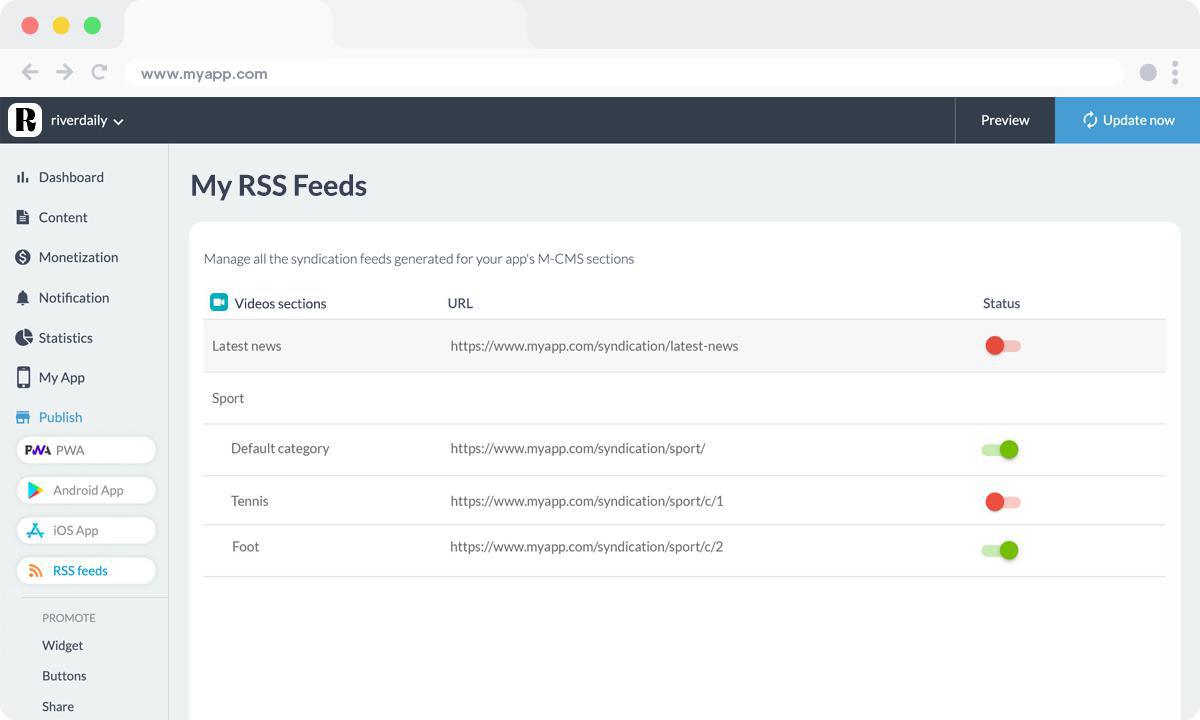 Como vimos no nosso post anterior sobre a nova extensão Artigos de feed RSS, os feeds RSS são uma ferramenta valiosa para a distribuição de conteúdo, permitindo que você alcance um público mais amplo além do seu app ou site. Ao gerar feeds de conteúdo para diferentes seções do seu app usando ferramentas como o M-CMS da GoodBarber, você pode distribuir facilmente seus artigos em plataformas externas de sua escolha. Isso não apenas amplia seu público, mas também simplifica o gerenciamento de publicações em vários sites.