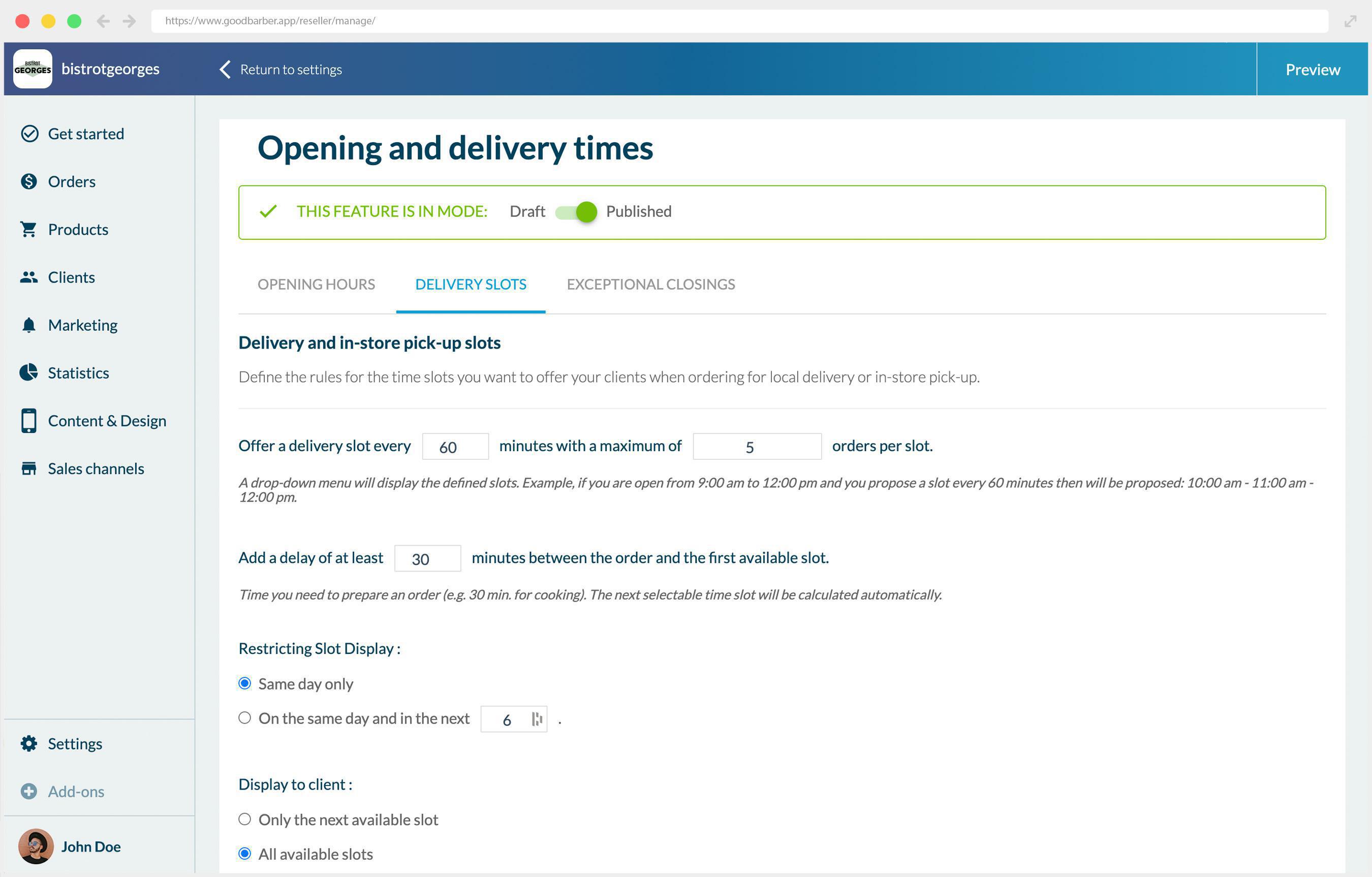 - Gerencie seu tempo de preparação, restringindo o número de pedidos por dia e intervalo de tempo.
