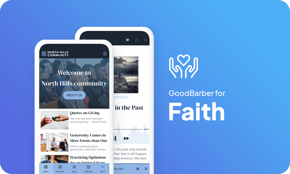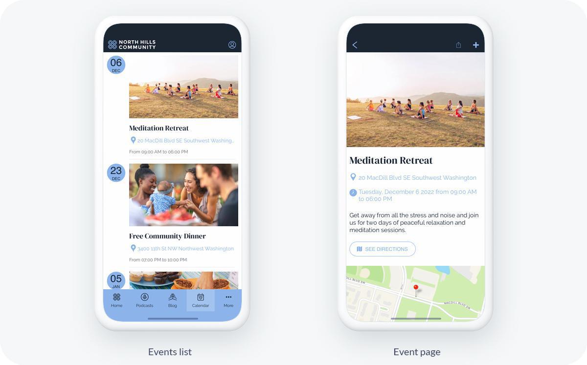 Escolha cores bastante sóbrias para trazer um caráter solene e calmante ao seu app. Cores brilhantes e berrantes não representam bem a espiritualidade. O North Hill Community é um app religioso que visa reunir os paroquianos de uma igreja. As cores escolhidas para este app são azul e preto. O azul predominante é uma reminiscência da espiritualidade. É um azul pastel bem suave, lembrando a cor do céu. O preto está presente em pequenos toques, para enfatizar certos detalhes, por exemplo. Essas cores dão ao app um caráter solene e calmante que reflete perfeitamente seu caráter religioso.