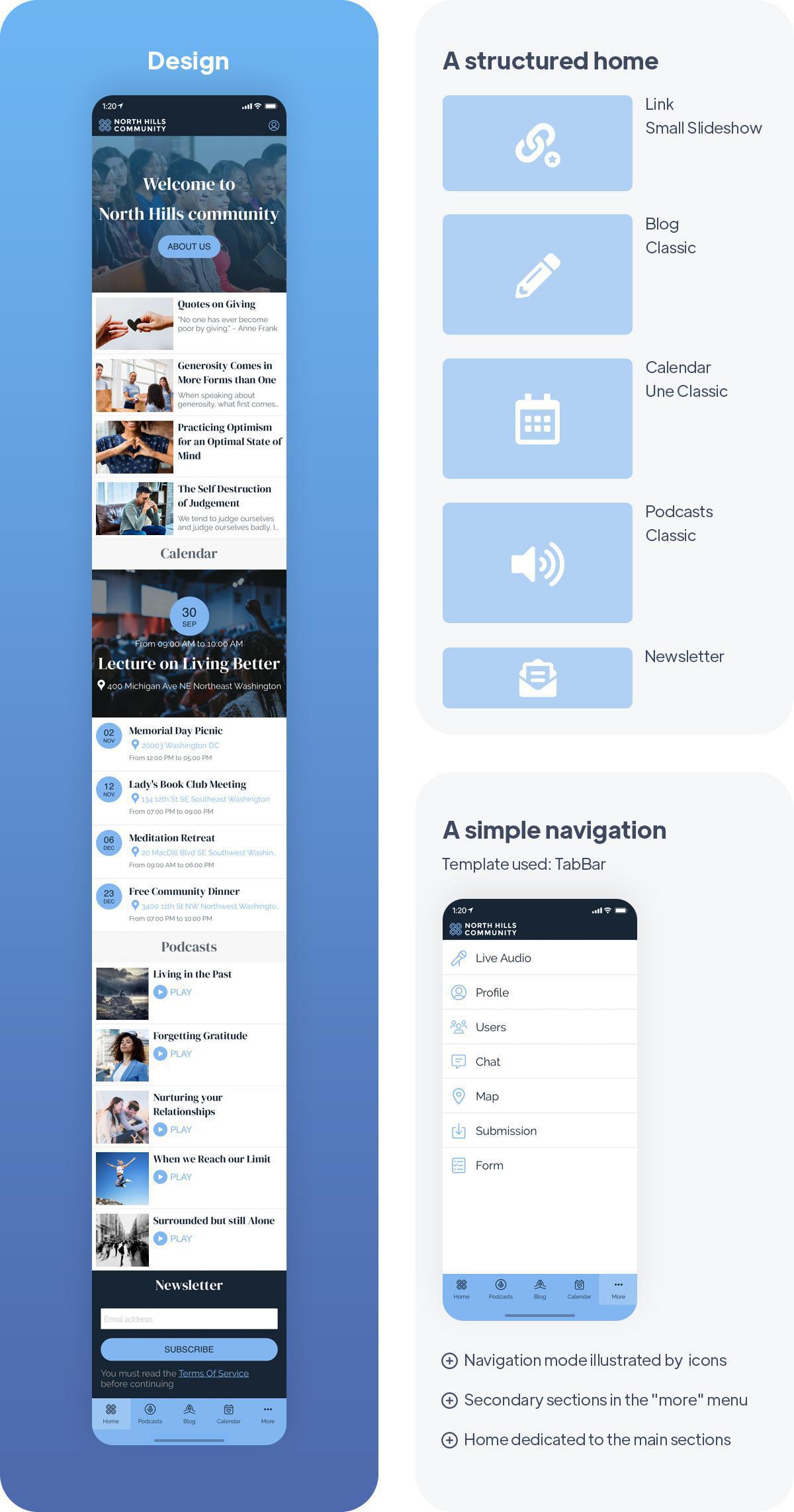 Para que seu design seja impecável, você também deve focar na estrutura do seu app. Deve ser intuitivo e a navegação deve ser simples, por isso é importante estruturá-lo adequadamente. A página inicial do seu app é muito importante, pois funciona como a página inicial. Deve reunir os principais elementos da sua candidatura, e estar devidamente esquematizado. A tela inicial da North Hill Community tem um primeiro Widget vinculado à seção Sobre, que apresenta a paróquia. Este Widget é destacado com uma ilustração e um botão Call To Action, pois é uma seção importante do app que fornece ao usuário as informações necessárias. De seguida encontramos os Widgets de Blog e Podcasts que nos oferecem uma visão geral do conteúdo do app, seguido de um Widget Newsletter, permitindo ao utilizador introduzir o seu endereço de email, e coletar dados. A página inicial deve ser otimizada, por isso reúne as seções mais importantes do app.