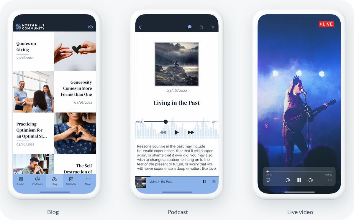 Por fim, se você deseja dar ao seu app uma sensação verdadeiramente imersiva, também pode integrar o recurso Live Audio ou Live Video, que permite que você se comunique com sua comunidade ao vivo! Esta é uma ótima opção se sua comunidade abrange diferentes localizações geográficas ou se você não tem acesso a um local de culto físico. Dessa forma, você pode interagir espontaneamente com sua comunidade.