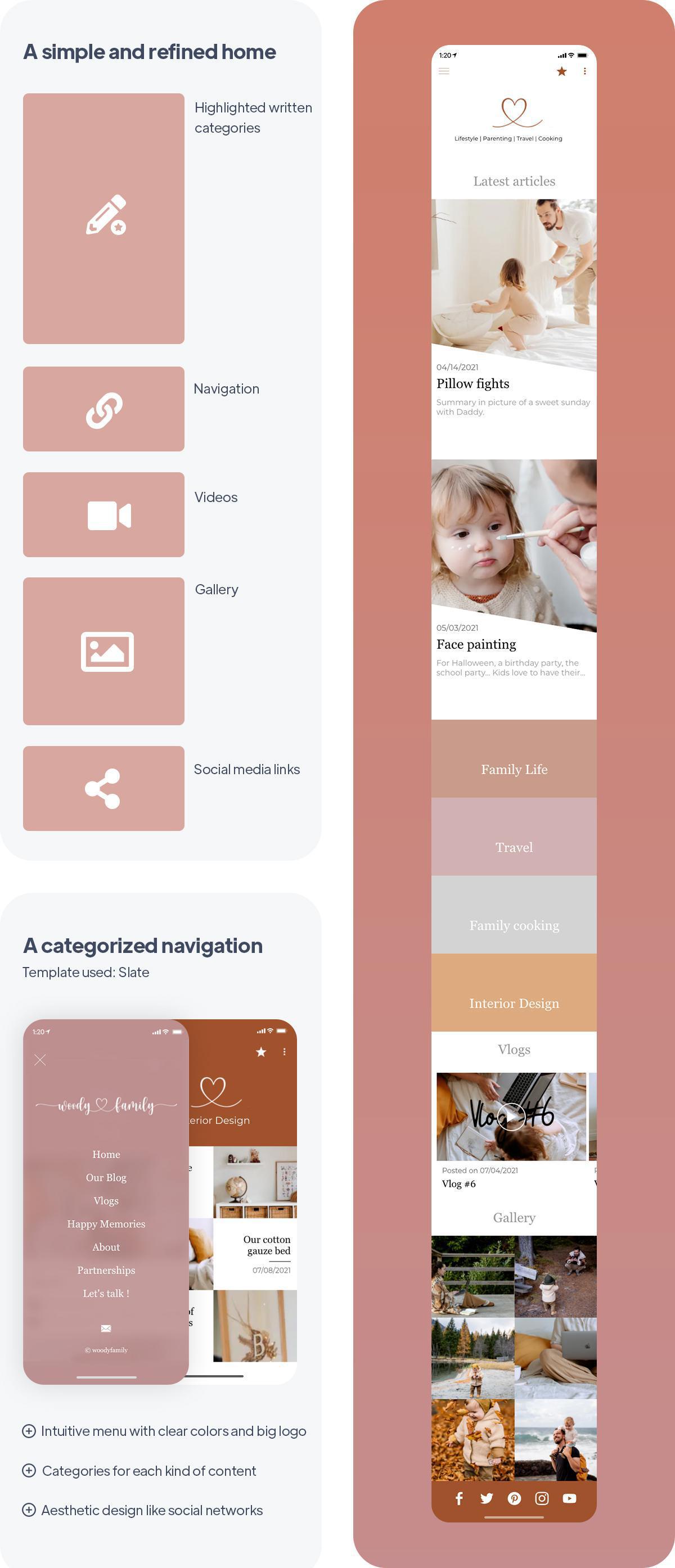 O menu de navegação escolhido é o Slate, um menu suspenso de um clique localizado no canto superior esquerdo da tela. Como a página inicial, é uma opção de menu clara e intuitiva, permitindo fácil acesso às categorias. Ele apresenta o logotipo da Woody Family exibido em grande, e as diferentes seções. É uma escolha refinada e harmoniosa, alinhada com o design elegante do aplicativo.