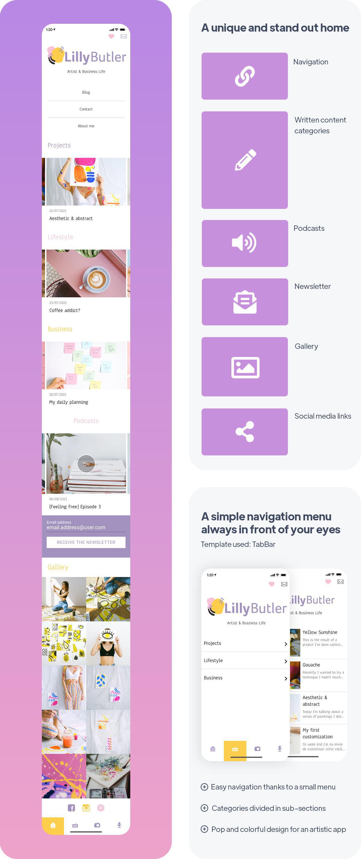 Seu aplicativo é o reflexo da sua personalidade, é a principal ferramenta da sua marca pessoal. O aplicativo LillyButler é um aplicativo de criador de conteúdo independente, possui um design diferenciado, permitindo que os usuários mergulhem no universo específico e único do criador.