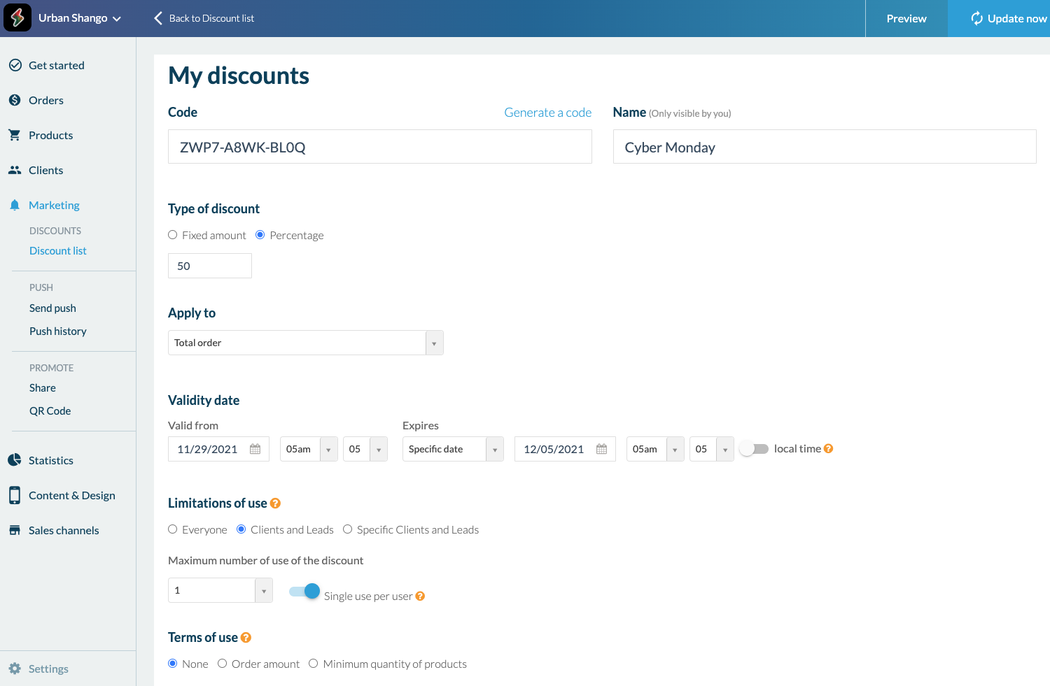 No menu Marketing > Desconto > Lista de descontos > Criar um desconto, os proprietários geram um código para esta campanha específica e configuram todas as condições a serem aplicadas: