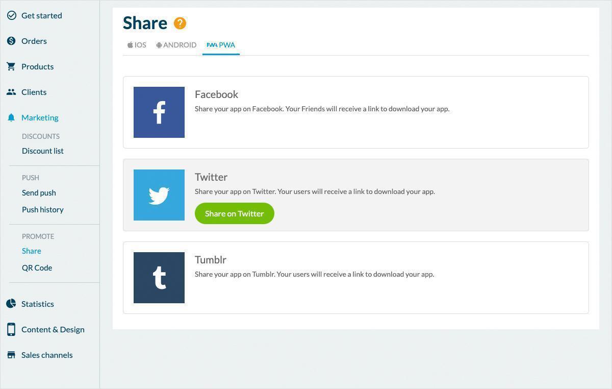 No backoffice do aplicativo de compras, você pode usar as ferramentas de promoção para exibir um link para fazer o download do aplicativo nas mídias sociais (Facebook, Twitter, Tumblr).