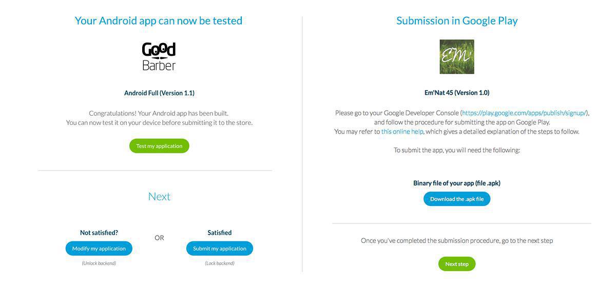 Se você estiver usando o Goodbarber, você encontrará um guia passo a passo fácil de usar no backend do seu aplicativo. Desde a criação do seu aplicativo, teste da versão do AdHoc, importação do seu arquivo .apk até a publicação do seu aplicativo, estamos aqui para orientá-lo ao longo do caminho.