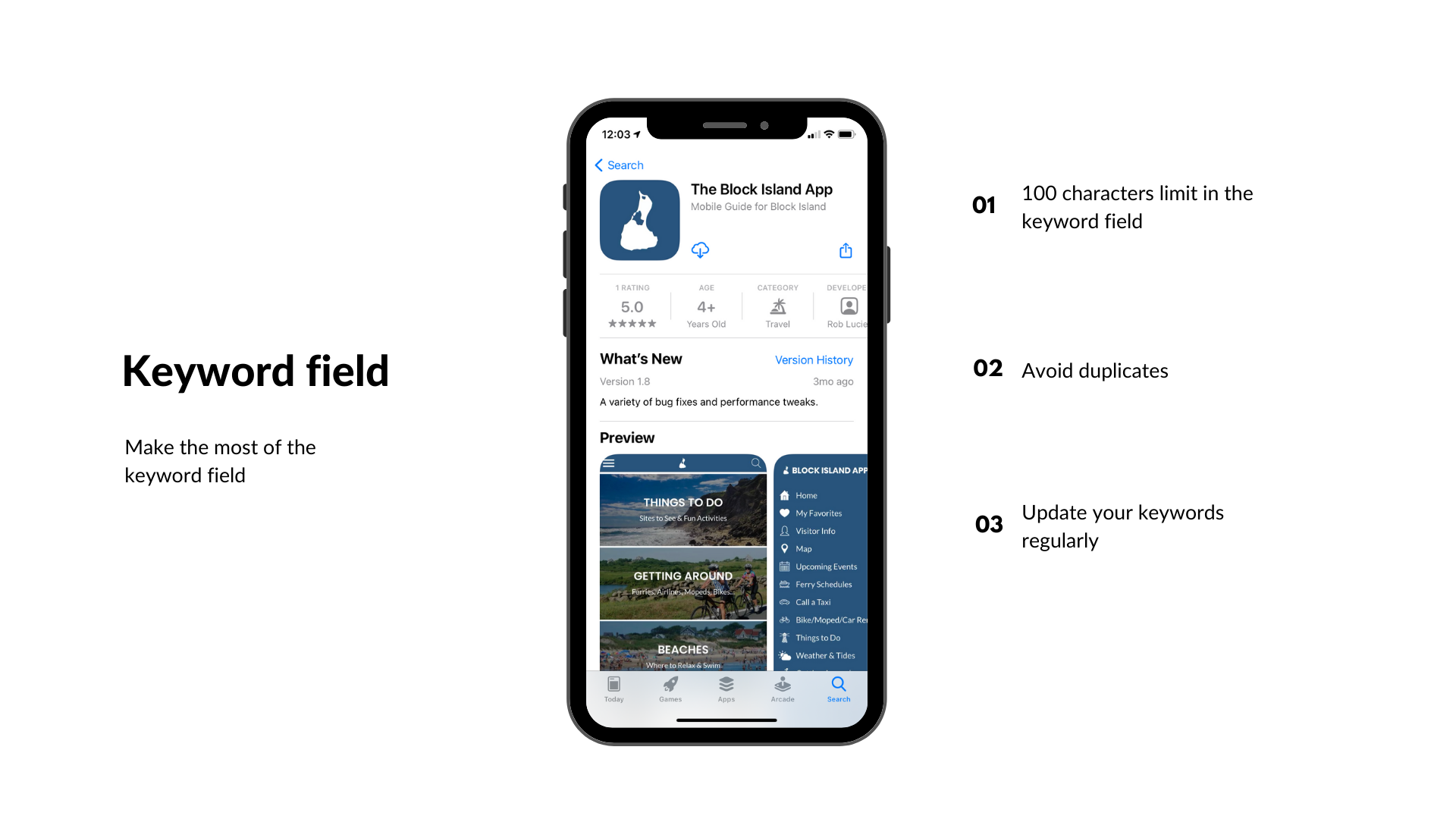 O campo de palavra-chave é limitado a 100 caracteres no total, usando uma vírgula para separá-los. Existem algumas diretrizes a serem seguidas: evite usar plurais, duplicatas, caracteres especiais ou a palavra "app". Definitivamente, não use nomes de concorrentes, nomes de celebridades, termos de marcas registradas, esses são os motivos para rejeições da App Store.