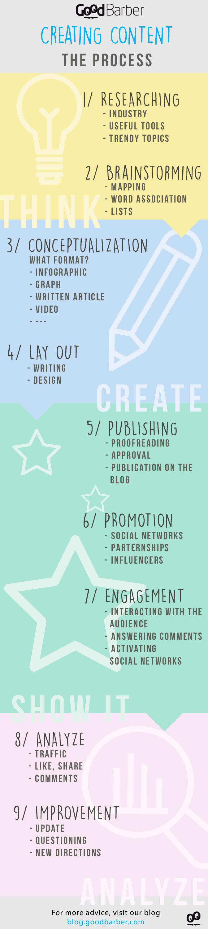 Você vai se deparar com escolhas nesta fase, em particular quando se trata de escolher o lay out certo para conte;udo que irá promover a sua marca. Você vai com um infográfico, um texto simples ou um vídeo? Você quem decide! O fato é que conteúdos visuais são conhecidos por criar mais impacto sobre os leitores. No entanto, seja realista, quando se trata de suas habilidades, tempo que você tem para entrar e, acima de tudo, o orçamento.