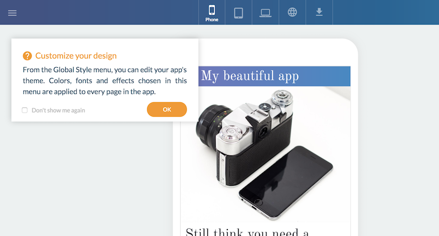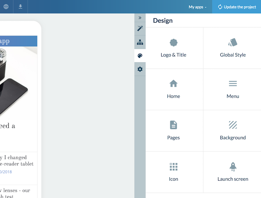 O novo menu Design no Construtor reúne todos os parâmetros para configurar o design do app. Existem muitos parâmetros, mas como eles são bem organizados, é fácil encontrá-los.