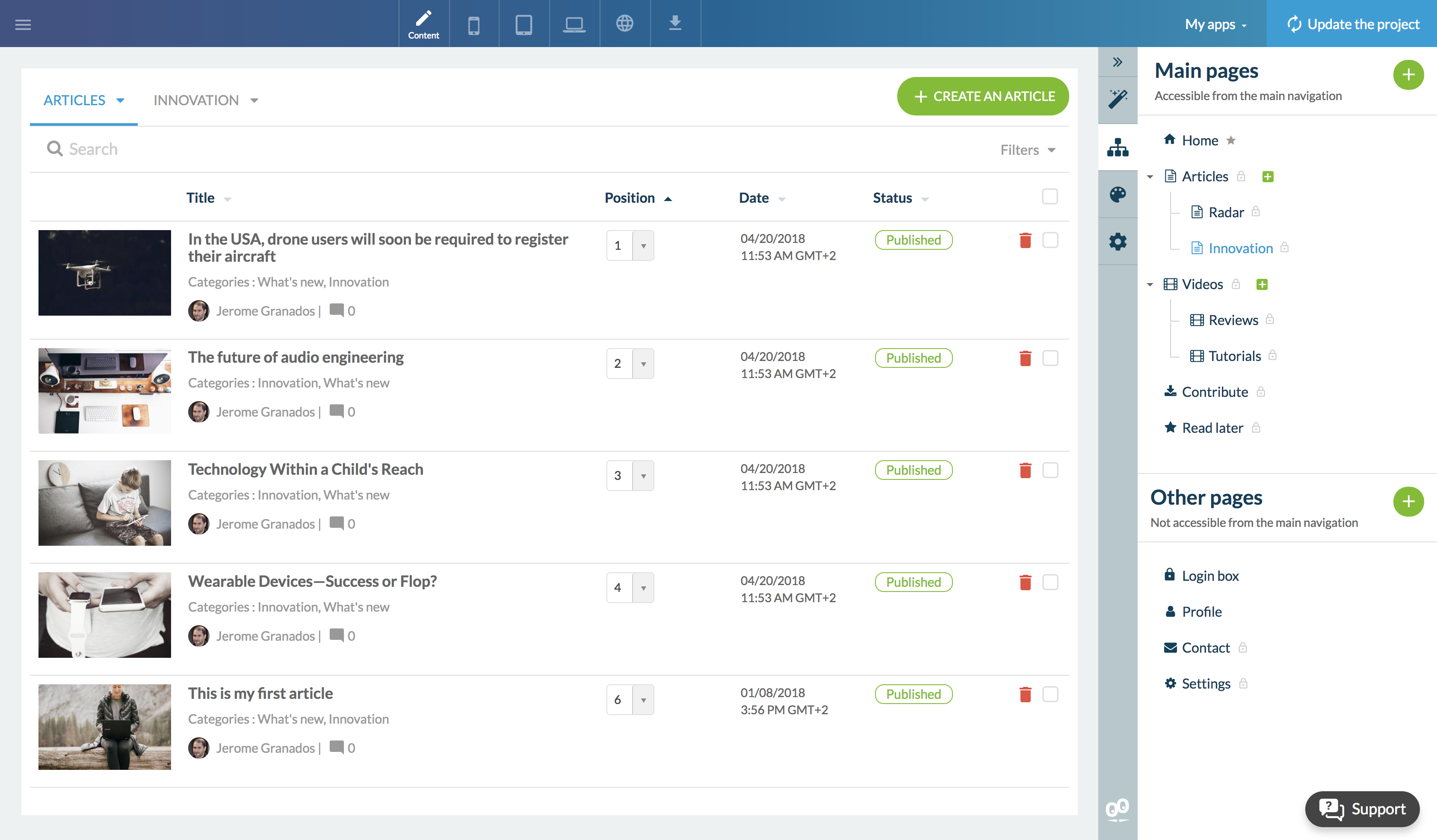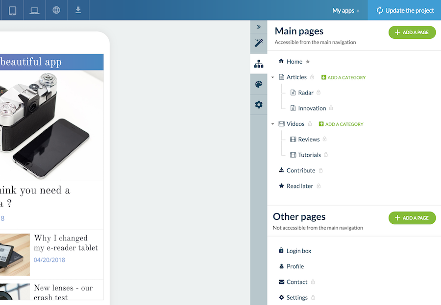 A estrutura do aplicativo fica imediatamente visível quando você acessa ao menu Conteúdo. A hierarquia entre as páginas e a presença de categorias são exibidas claramente no painel. As ações principais - adicionar páginas/adicionar categorias - são facilmente acessíveis por botões de ação altamente visíveis.
