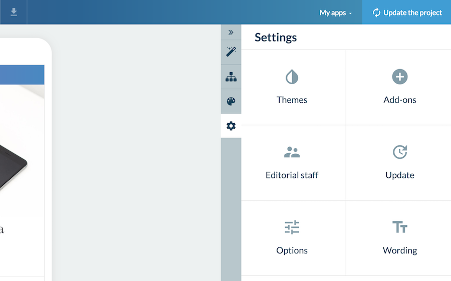 O menu Configurações no Construtor é feito de atalhos e links para as principais ações. Enquanto estiver no construtor, você poderá acessar o catálogo de add-ons neste menu, gerenciar sua equipe editorial ou visualizar o log de atualizações das modificações pendentes.
