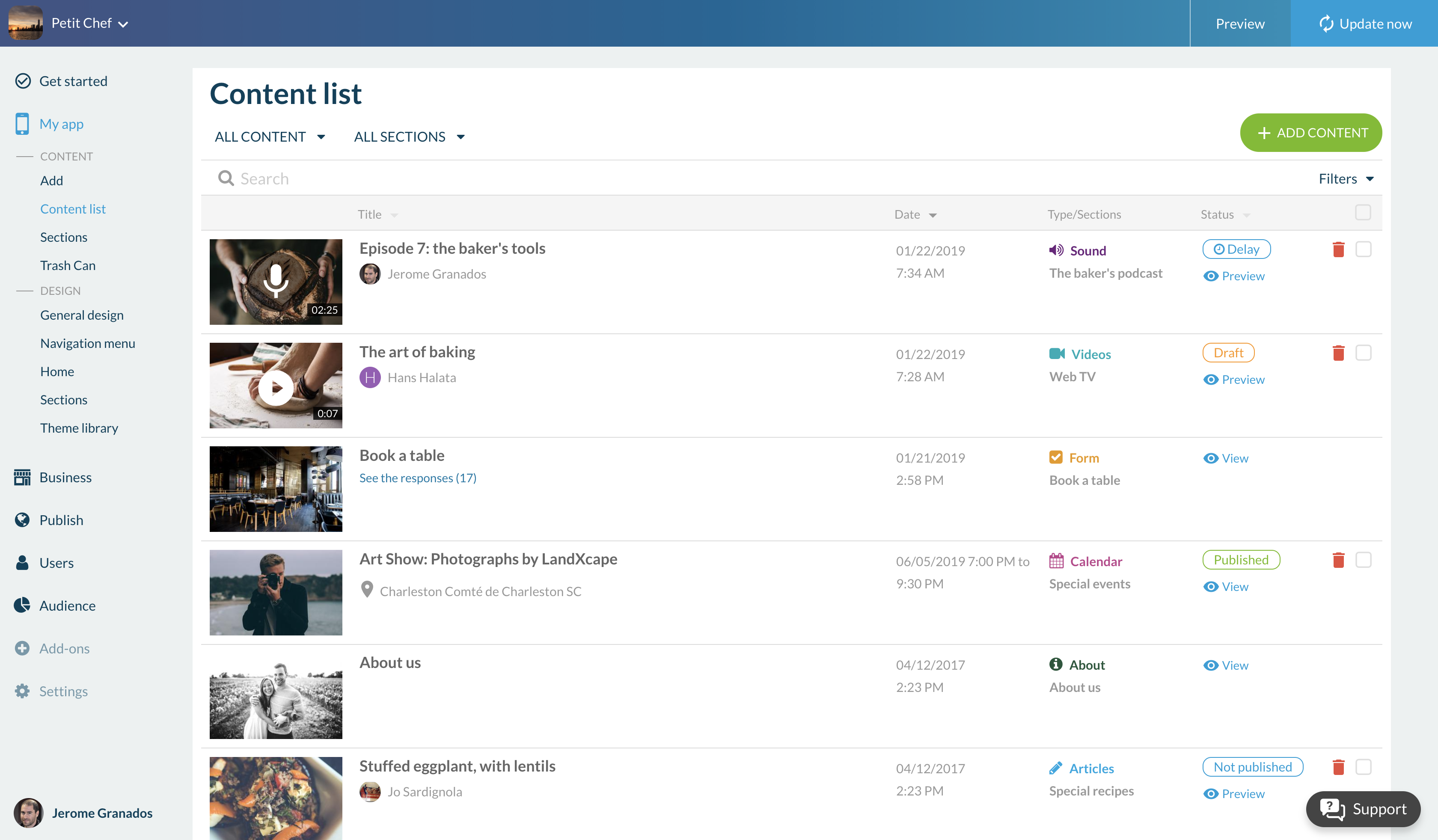 O novo menu Meu App > Conteúdo contém todos os recursos para criar e gerenciar conteúdo. A partir daqui, você poderá adicionar artigos, vídeos, fotos, eventos, podcasts, etc.