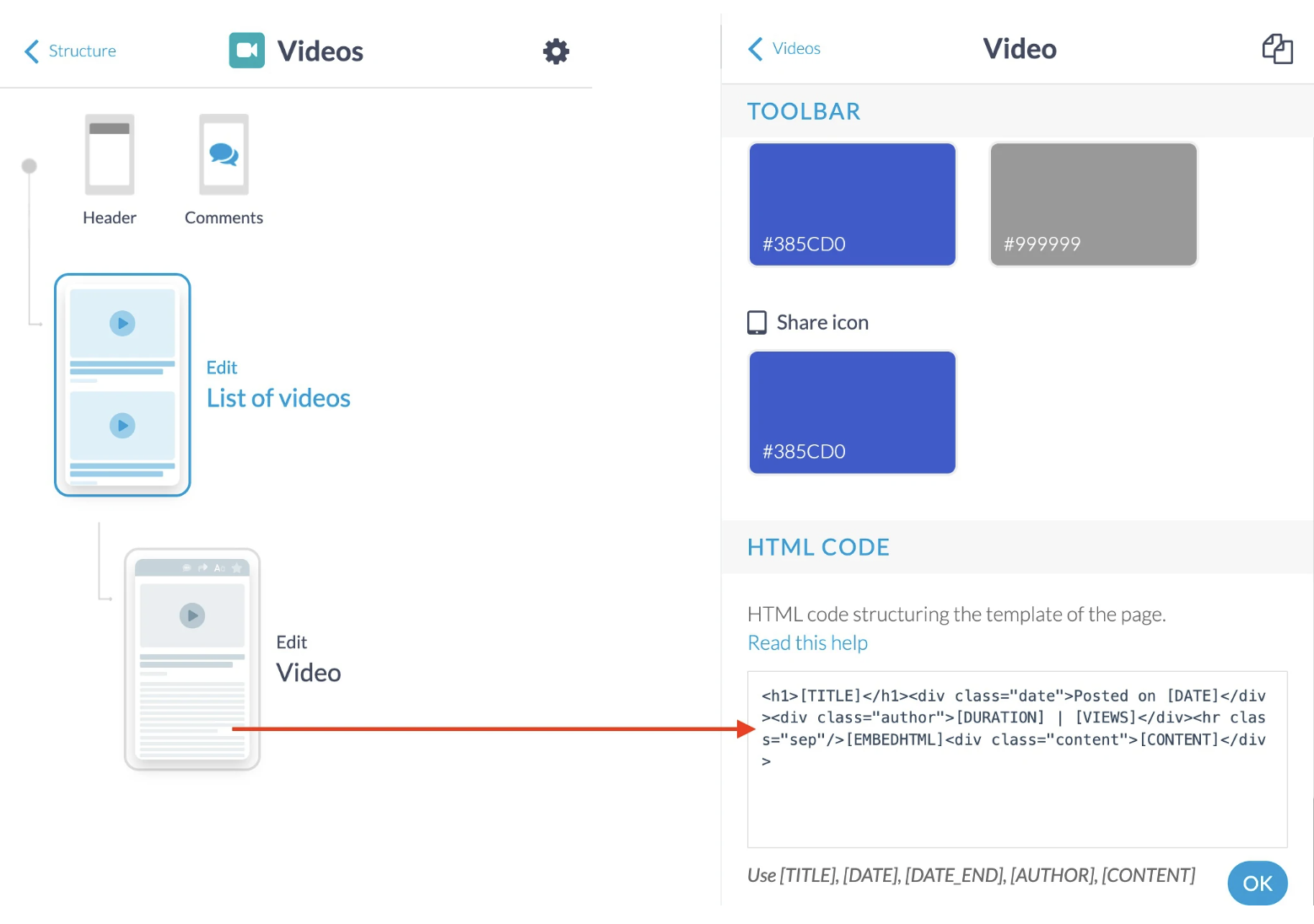 No modelo de exibição de artigo e no modelo de exibição de vídeo do seu app, há um campo chamado "Código HTML" que permite inserir seu próprio código, bem como invocar a API do App GoodBarber.O código que você adicionar no campo de modelo será executado ao exibir todos os artigos ou vídeos na seção correspondente