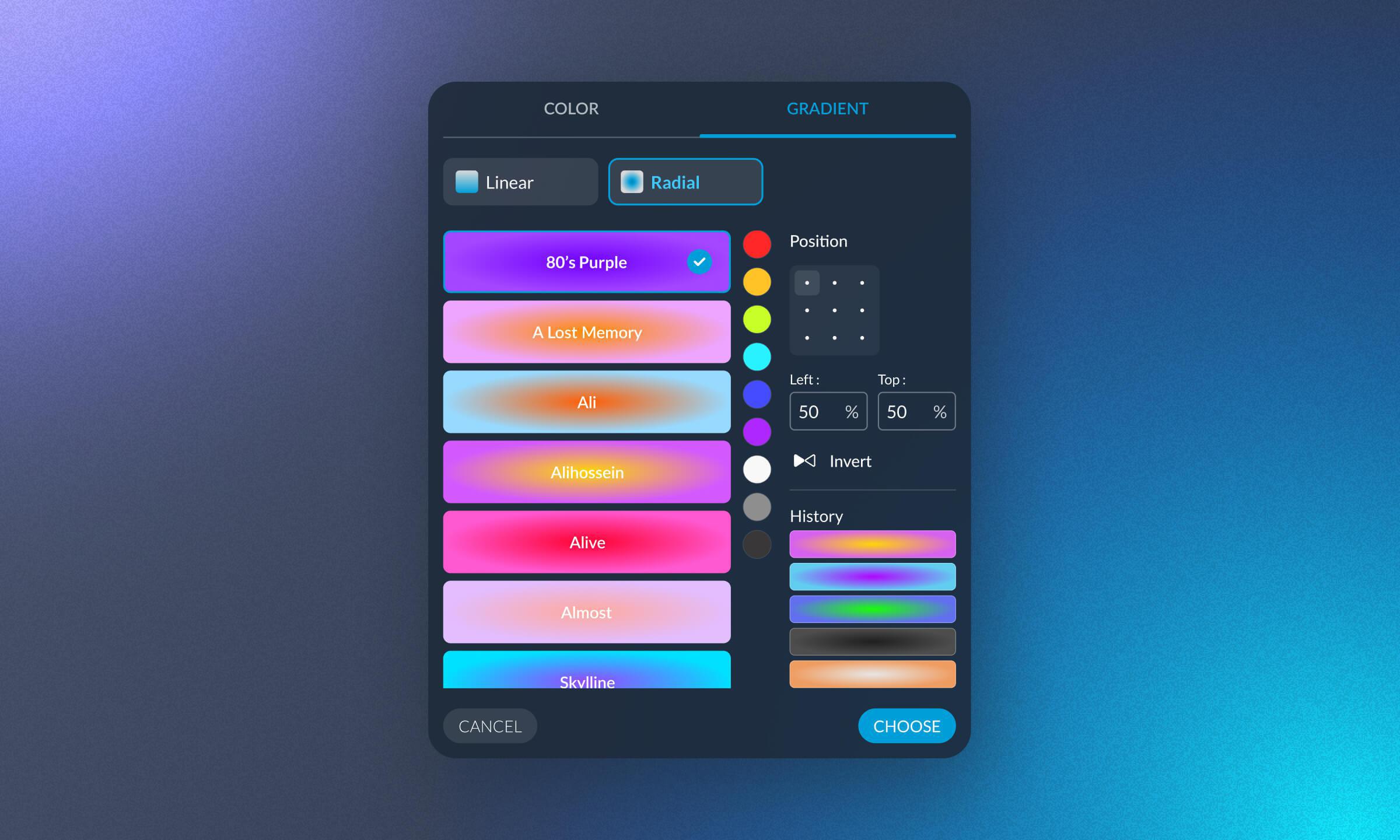 - Aplique essa cor diretamente aos gradientes ou a qualquer outro elemento do aplicativo (planos de fundo, botões, widgets etc.).