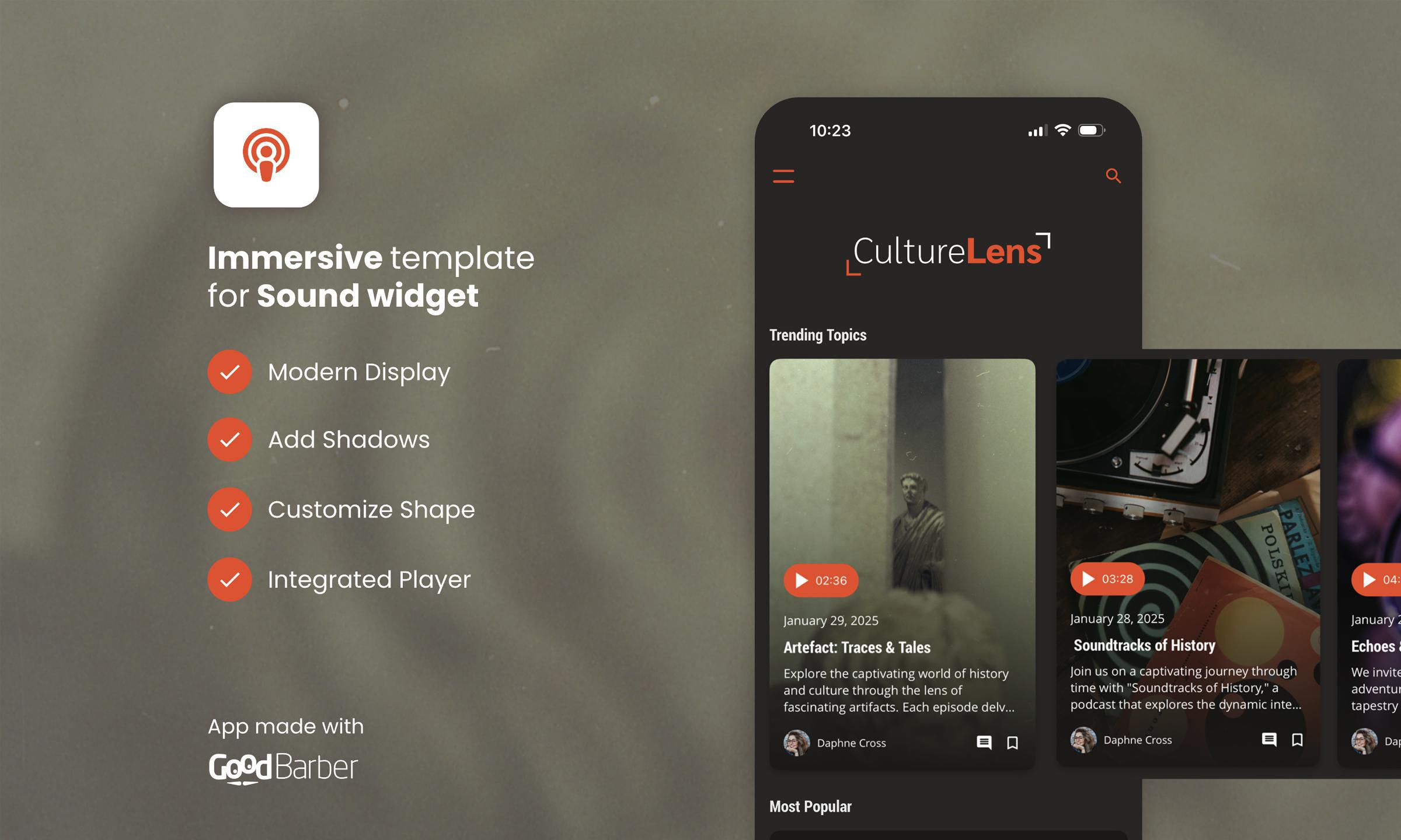 Seu design limpo, a facilidade de uso e as opções de personalização fazem dele uma opção obrigatória para quem deseja integrar conteúdo de áudio em um aplicativo GoodBarber. Ele transforma a experiência auditiva em uma experiência interativa e visualmente agradável, ao mesmo tempo em que oferece um gerenciamento simples e eficaz do conteúdo de áudio.