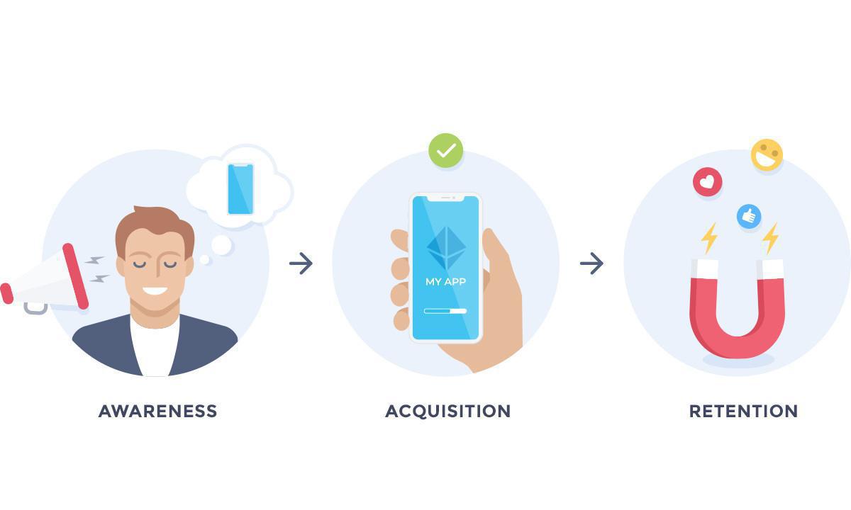 O marketing de aplicativos para celular consiste em todas as ações/campanhas de marketing que você criará para envolver seus usuários durante as 3 diferentes fases da jornada: