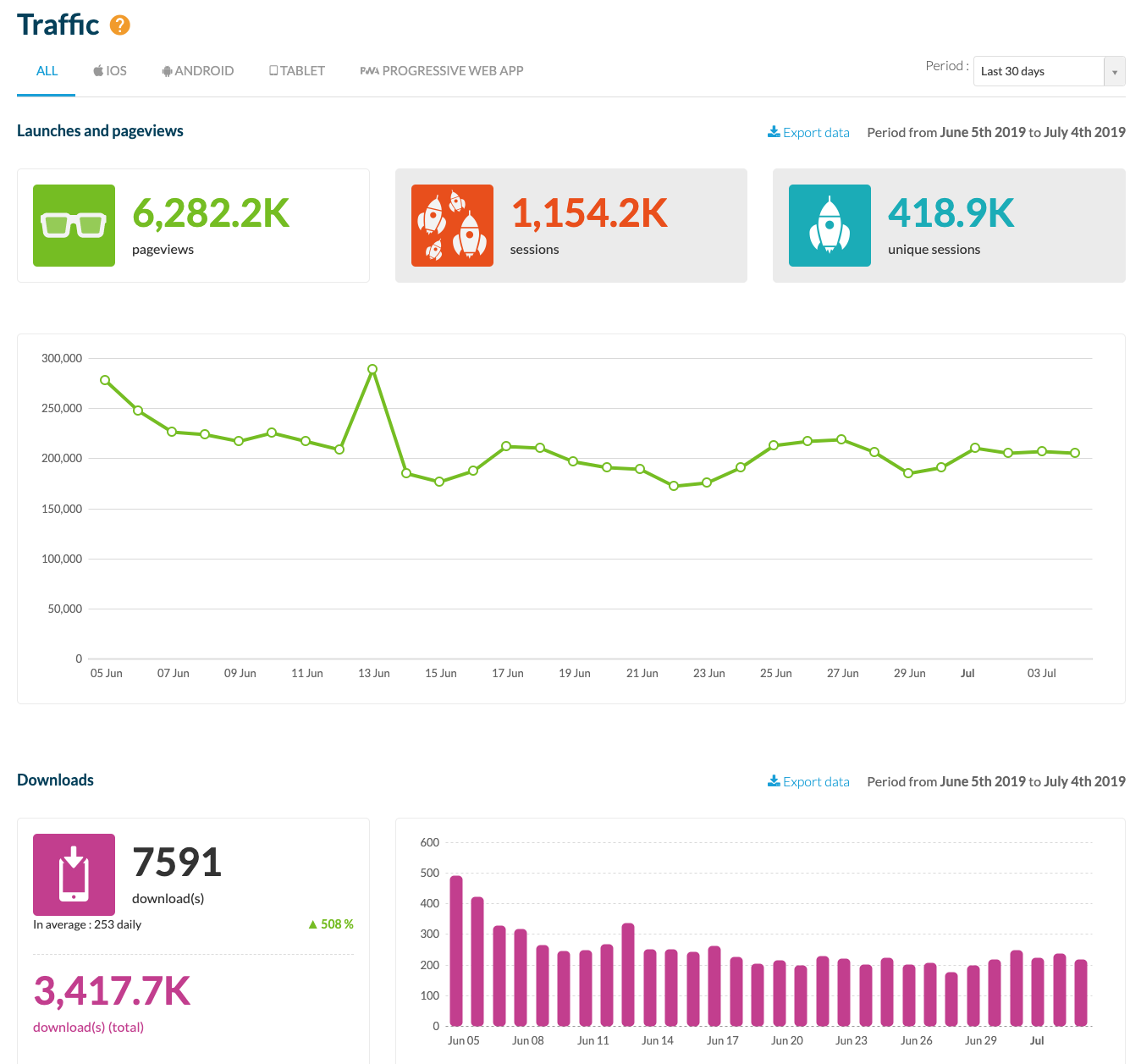 Se você estiver usando a GoodBarber, terá acesso a um painel para visualizar algumas estatísticas principais em um só lugar. Além disso, nossos engenheiros já cuidaram da implementação do Google Analytics para Firebase . Tudo o que você precisa fazer é seguir as diferentes etapas de configuração do console do Firebase (https://console.firebase.google.com/ ) para começar a coletar eventos em seu aplicativo e enviá-los ao Firebase.