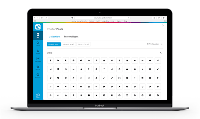 Deixa eu te contar, os nossos designers não tiveram muito descanso ultimamente, a partir de agora, você pode escolher entre mais de 1500 ícones para ilustrar suas seções. Vamos apenas dizer que aqui, na GoodBarber, nós não gostamos de fazer uma meio de trabalho.