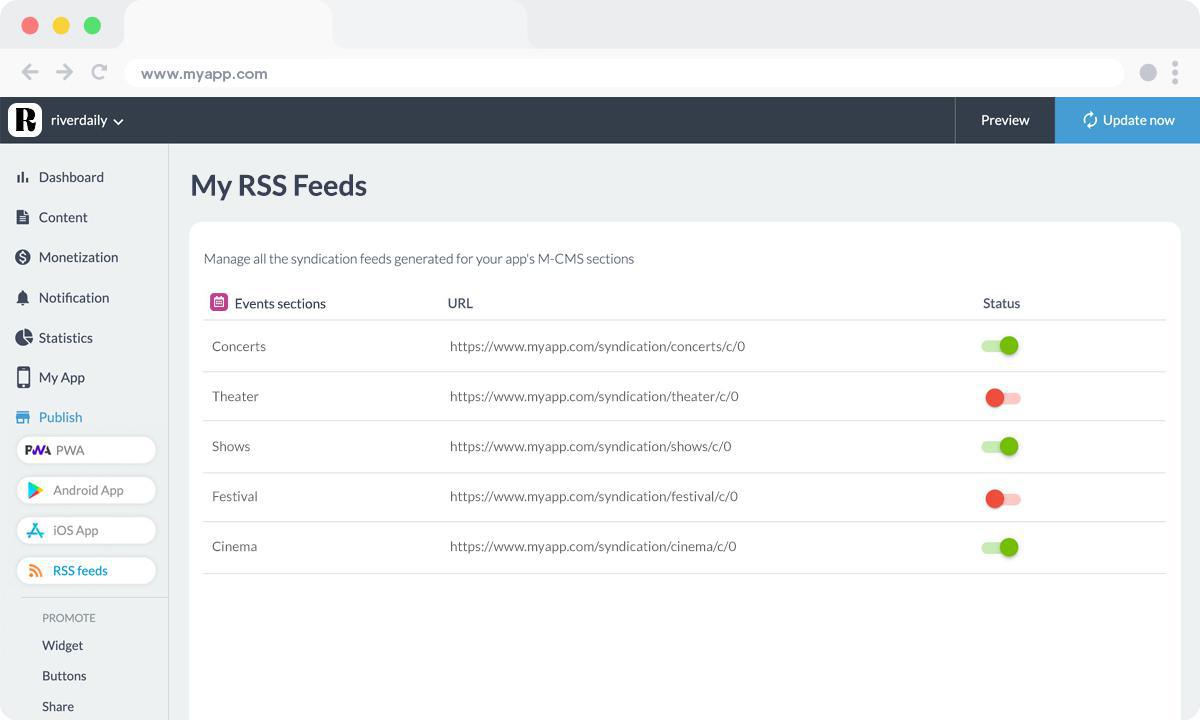Os feeds RSS são uma ferramenta valiosa para a distribuição de conteúdo, permitindo que você alcance um público mais amplo além do seu aplicativo ou site. Ao gerar feeds de conteúdo para diferentes seções do seu aplicativo usando ferramentas como o M-CMS da GoodBarber, você pode distribuir facilmente seu conteúdo em plataformas externas de sua escolha. Isso não apenas amplia seu público, mas também simplifica o gerenciamento de publicações em vários sites.