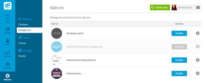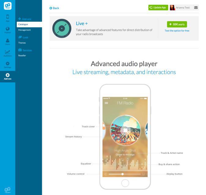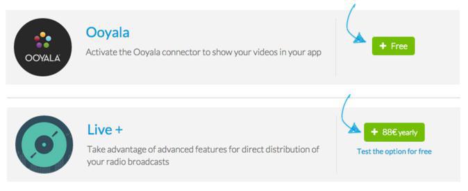 Na loja de Add-Ons podes ainda encontrar outros serviços pagos que estão disponíveis para compra, tais como a seção Live+, o acesso aos APIs da App e ainda a nova opção de Marca Branca para a tua app.