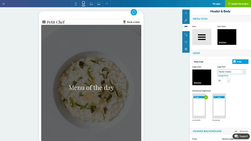 É possível personalizar a exibição do cabeçalho de acordo com a seção. Por exemplo, em um aplicativo de cozinha, você pode ter um cabeçalho específico para uma seção "Receitas" e outro para uma seção "Eventos". Esta opção oferece muita flexibilidade, mas fique atento para manter algum senso de consistência entre os vários cabeçalhos para que não confunda seus usuários.