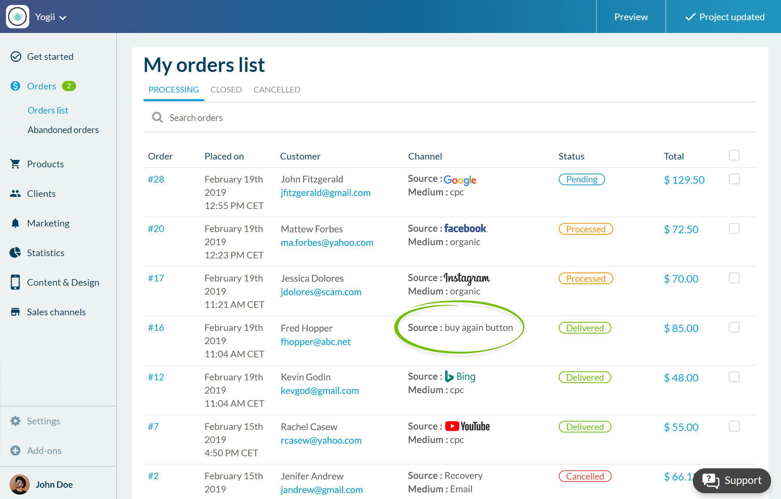 Os seus clientes poderão renovar uma encomenda com um simples clique. O botão "Comprar novamente" permite-lhes adicionar ao carrinho todos os produtos de uma encomenda existente.