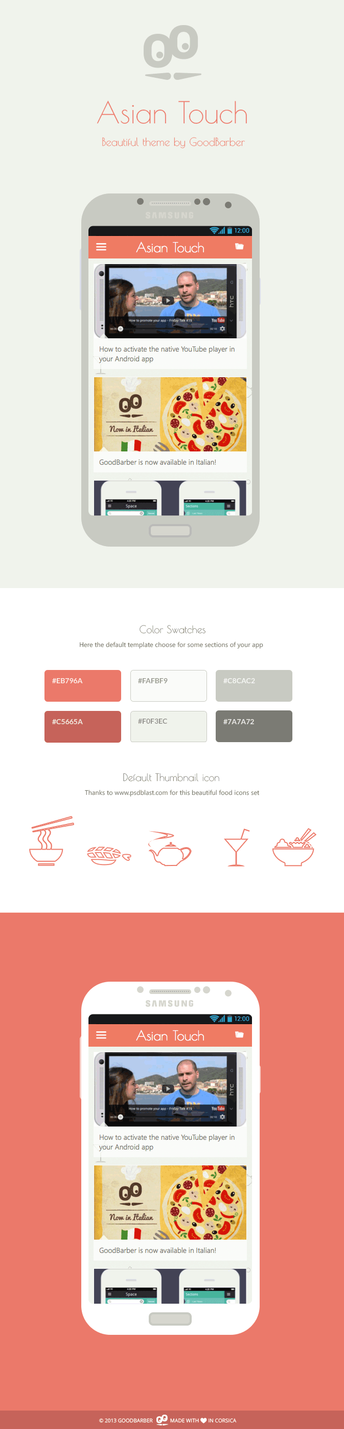 O Asian Touch é um dos mais de 50 temas disponíveis no back office da GoodBarber. Use como ponto de partida para criar o seu Beautiful App.