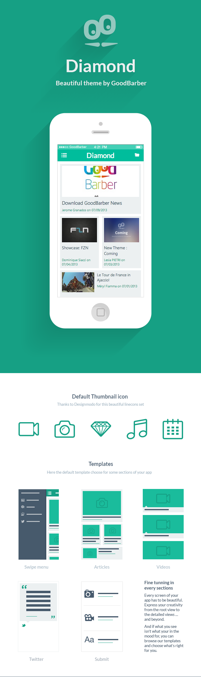 O Diamond é um dos mais de 50 temas disponíveis no back office da GoodBarber. Use como ponto de partida para criar o seu Beautiful App  .