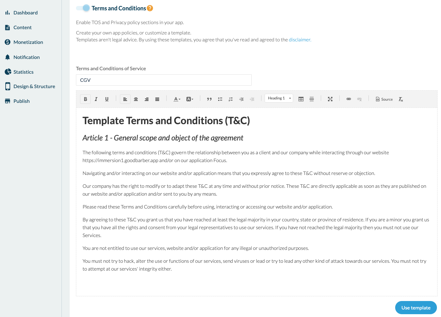 Para ajudá-lo a escrever seus Termos de Serviço, criamos novos modelos, disponíveis diretamente no back office do seu app.