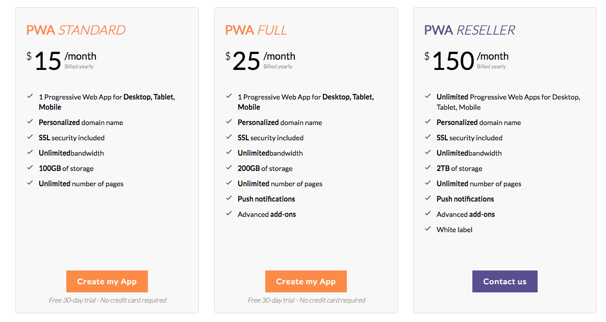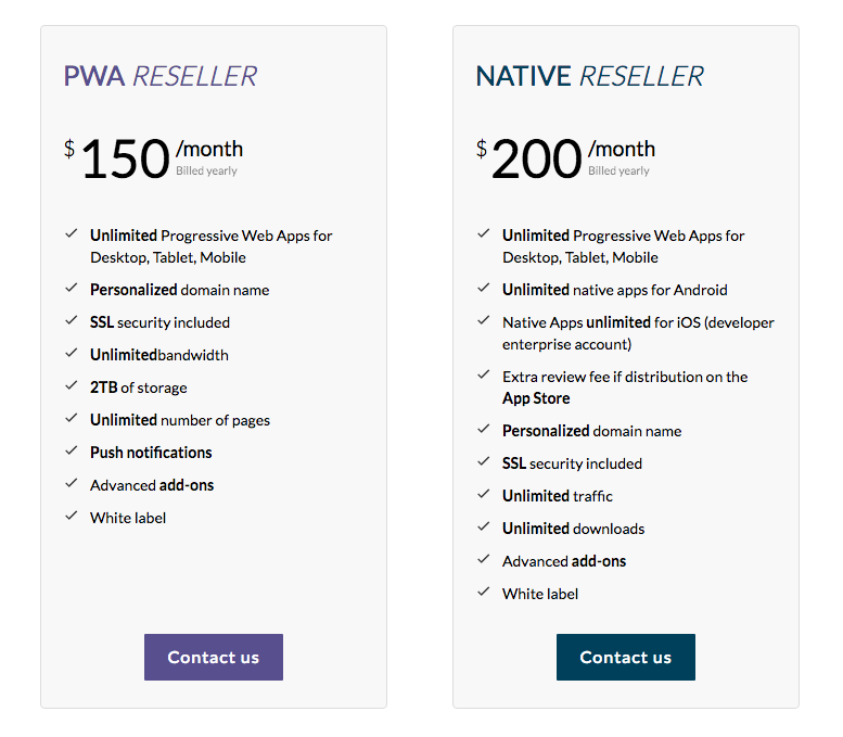Descubra a oferta Reseller PWA! Ela permite a você criar Progressive Web Apps ilimitados. Os PWAs criados beneficiam de todas as funcionalidades disponíveis na oferta PWA full.