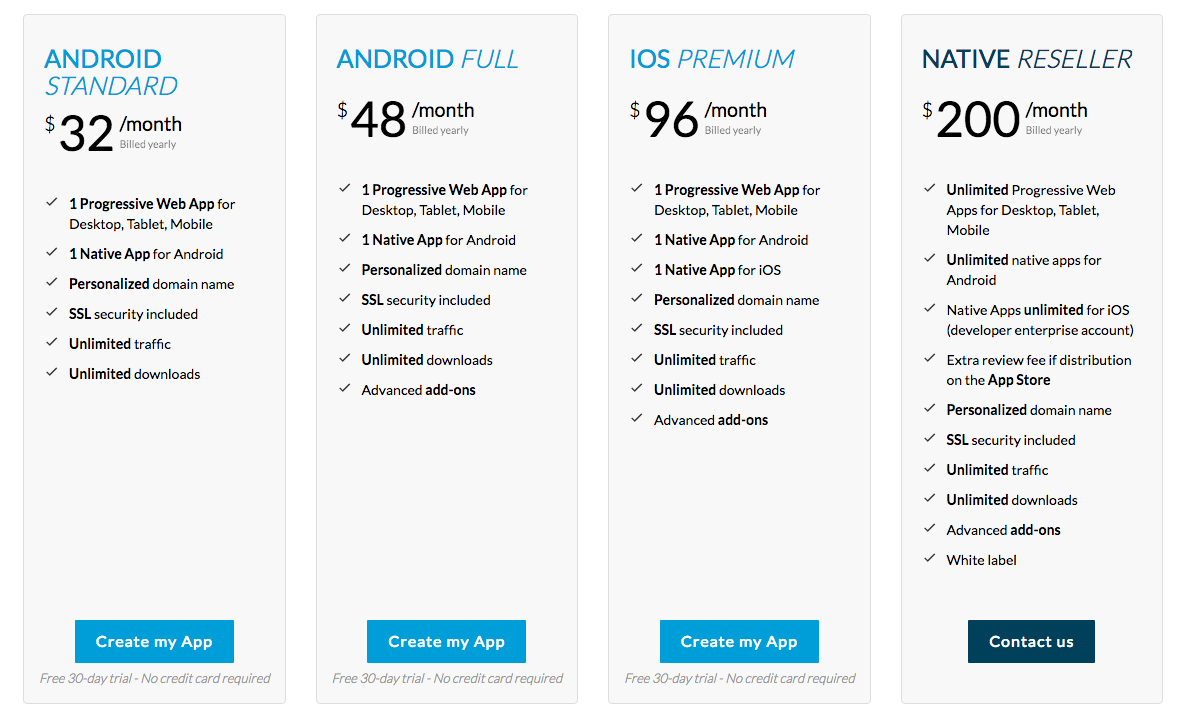 Com a oferta Reseller nativo, você pode criar apps nativos ilimitados (Android & iOS) e PWAs (iOS apps que pretenda distribuir na App Store estão sujeitos a custos adicionais).