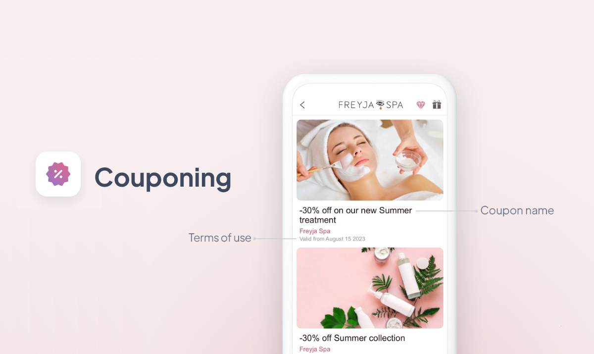 A extensão Couponing também tem como objetivo aumentar as vendas, oferecendo descontos exclusivos em produtos ou serviços. Pode categorizar os seus cupões, escolher todos os seus parâmetros e condições de utilização e permitir que os seus clientes resgatem imediatamente ofertas exclusivas ou guardem cupões para compras futuras. Pode também acompanhar o desempenho das suas campanhas de cupões em tempo real e ajustar a sua estratégia de marketing em conformidade. Pode encontrar mais informações sobre o funcionamento desta extensão na página Couponing .