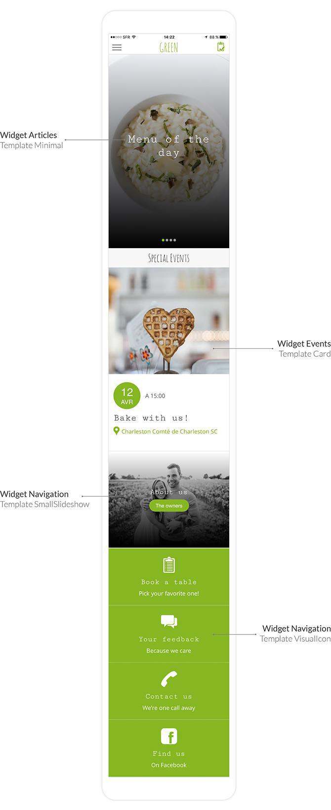A Home é a tela principal do aplicativo. Com uma finalidade similar a da homepage de um site, mas com uma UI mobile, que se adapte a uma tela mais grande de forma simples e suave. O espaço é praticamente dividido em fatias horizontais, onde cada fatia pode hospedar um módulo funcional, chamado de widget. Um widget pode exibir conteúdo ou servir como um link para um destino específico. Ao definir a sequência de widgets é possível configurar uma Home que atua como a principal navegação do aplicativo, enquanto exibe dinamicamente o conteúdo.