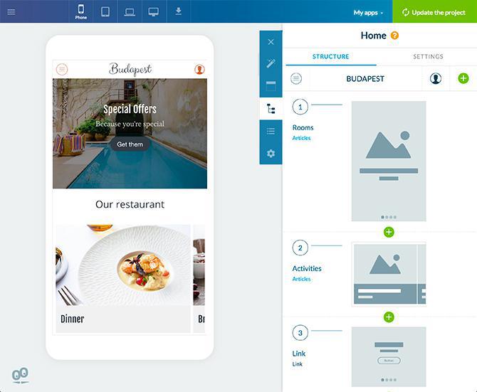 Agora você pode criar seu aplicativo a partir de um novo menu, chamado Construtor. A ênfase está na clareza. Uma grande parte da tela, no centro, é dedicada a visualizar seu aplicativo. Em termos de concepção, o ponto de partida ainda é a construção da UI para smartphones. As ações de configuração são intuitivas graças ao uso de mockups muito realistas no painel lateral. Também é possível ocultar o painel e escolher uma visualização diferente para exibir seu trabalho em celulares, tablets, laptops e desktop. Isso lhe dá uma idéia precisa de como a UI mobile se adapta a uma tela maior.