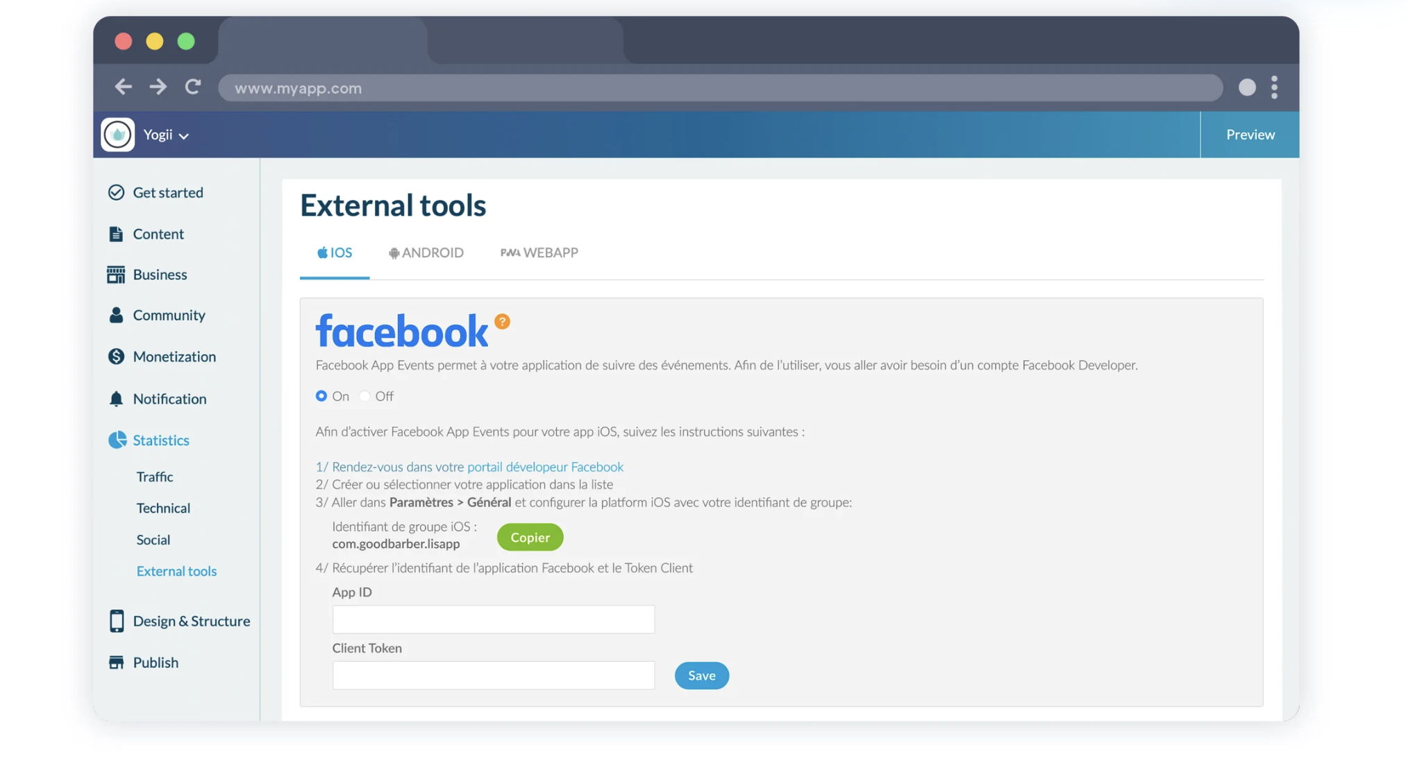 A GoodBarber oferece-lhe soluções para integrar a sua aplicação com o Facebook: Facebook Marketplace e agora Meta Pixel & Eventos do Aplicativo , permitindo-lhe analisar o comportamento do seu utilizador e otimizar a sua estratégia de marketing.