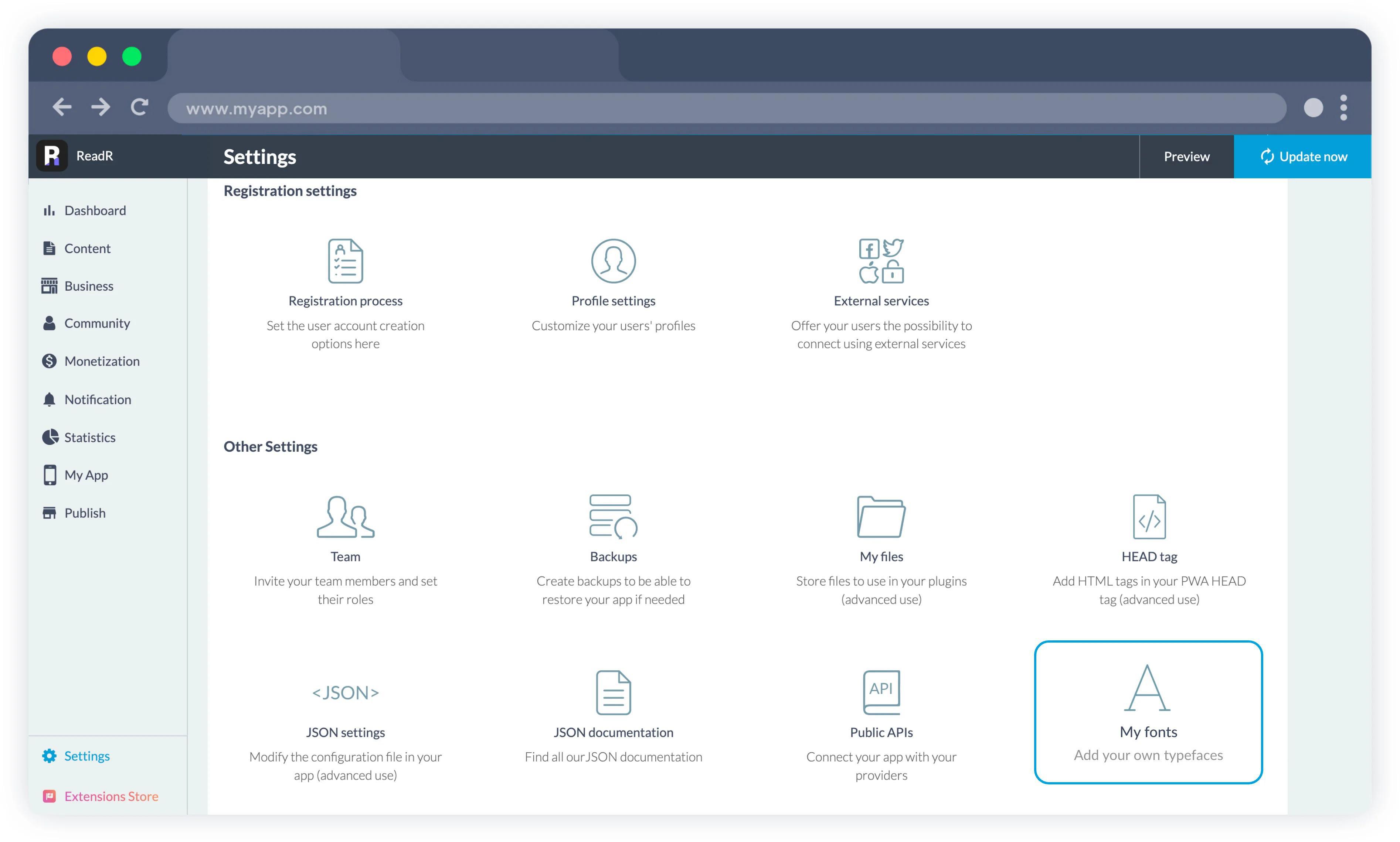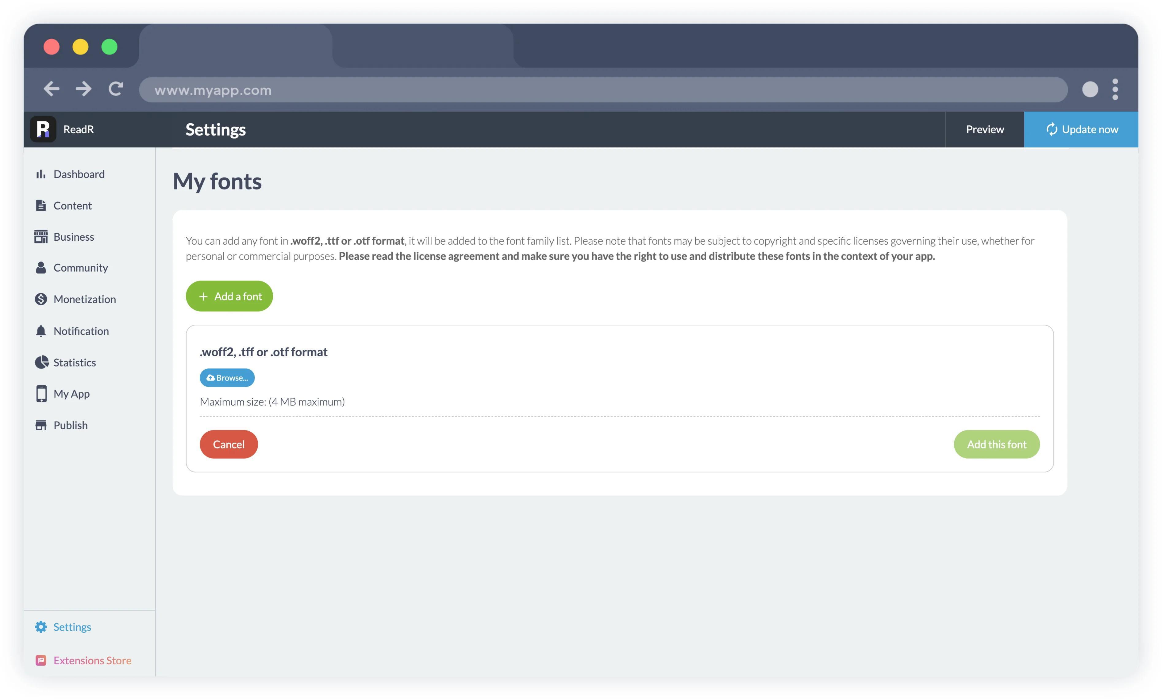 Você pode fazer o upload de sua fonte nos formatos necessários (.woff2 para Progressive Web Apps, .ttf ou .otf para aplicativos nativos). Você pode incluir até dez fontes personalizadas. Após adicioná-las, essas fontes personalizadas estarão disponíveis em todos os seletores de fontes no seu painel de controle.