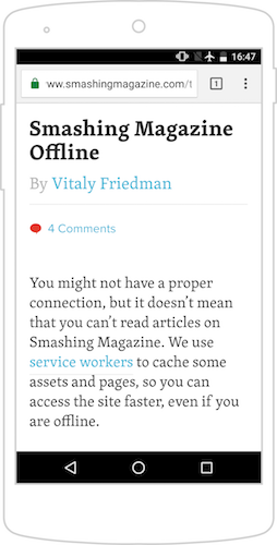 Para proporcionar uma experiência agradável para os usuários, mesmo quando eles não têm conexão à Internet, a Smashing Magazine permite que o aplicativo recupere e armazene dados em cache para que eles possam continuar navegando no aplicativo nesta situação. No exemplo acima, carregamos um artigo e logo depois ficamos offline (modo avião para ter certeza), e mesmo depois de atualizar a página o artigo ainda estava disponível para leitura.